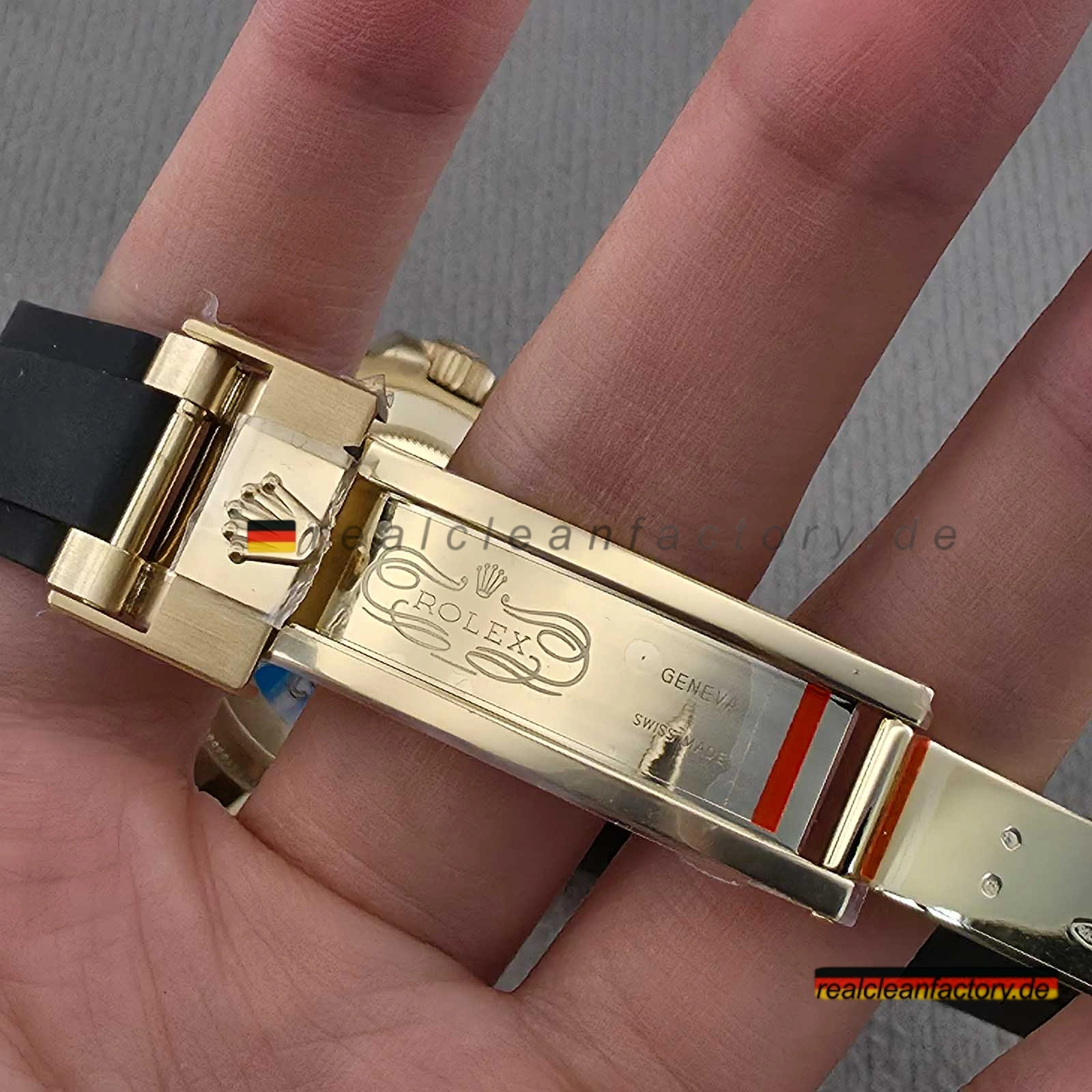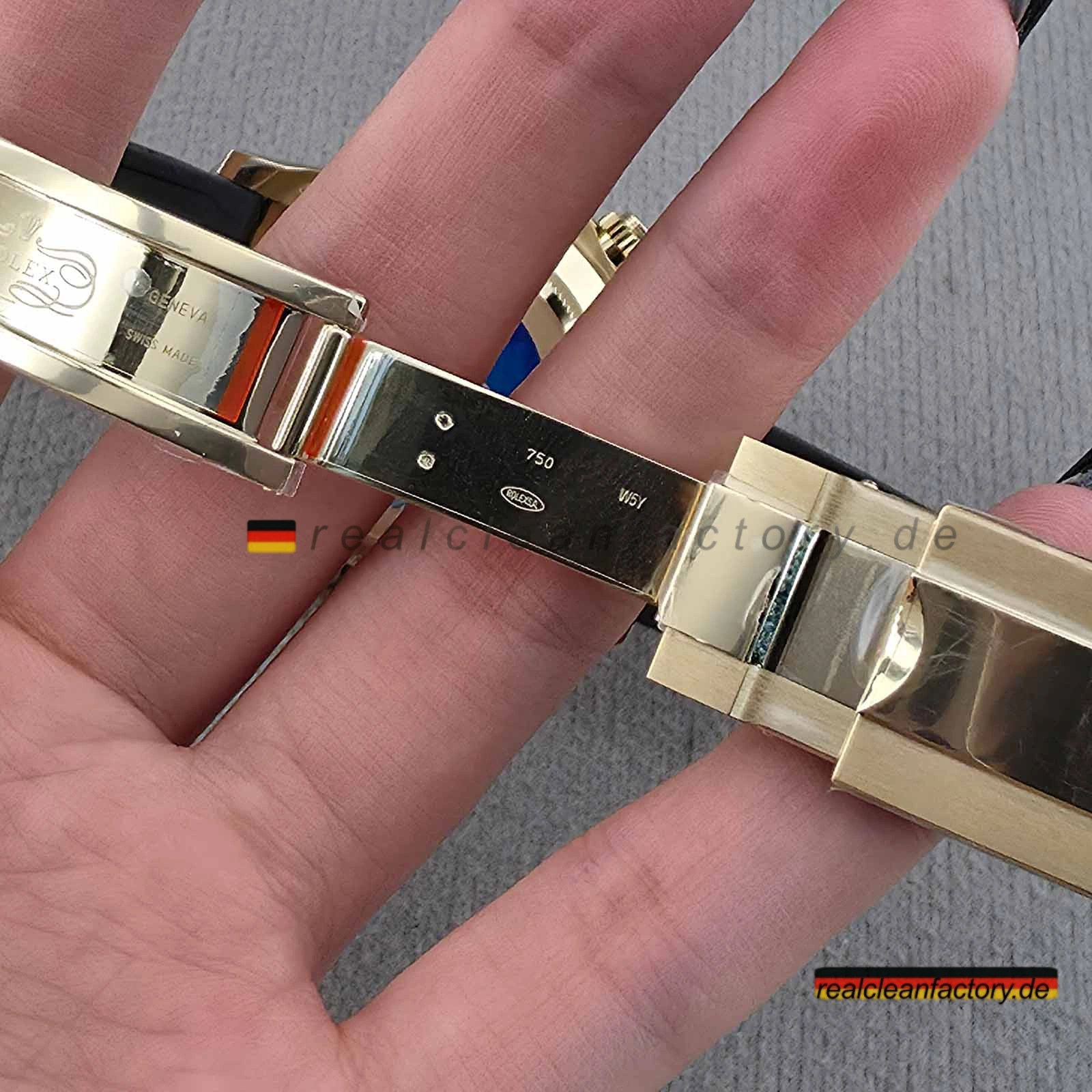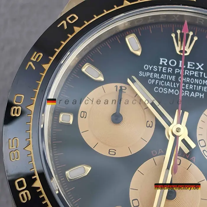 Die „Black & Champagne" Daytona — die einzige Reference, die Gold wirklich trifft. Die meisten Gelbgold-Daytonas scheitern am selben Punkt: der Farbe. Zu gelb, zu flach, oder nach wenigen Monaten verblasst. Die Clean Factory 116518LN-0047 löst das mit einem molekularen 18K-Goldbindungsverfahren auf 904L-Chirurgenstahl — derselbe warme, tiefe Goldton wie beim originalen Edelmetallgehäuse. Im Inneren: der Dandong DD4130 — das einzige Clone-Chronographenwerk, das das echte 12,2 mm Gehäuseprofil und 72 Stunden Gangreserve erreicht. Kein Kompromiss. Kein Millimeter zu dick. ✓ 18K Molekulare Goldbindung — Dickschicht-Verfahren auf 904L-Stahl. Warmer „Old Gold"-Ton, kein PVD-Gelb. Korrosionsbeständig und dauerhaft. ✓ Dandong DD4130 Kaliber — Echte 1:1 Slim-Architektur. 72h Gangreserve. Chronograph vor Versand 20+ Zyklen gestresst und verifiziert. ✓ Tiefes Metallic-Champagner Zifferblatt — Das Detail, das die meisten Konkurrenten verfehlen. Korrekt auf den Gehäuseton abgestimmt — nicht flaches Gelb. ✓ Cerachrom Keramiklünette — Kratzfest. Tachymeterskala goldgefüllt via Vakuumdeposition, nicht aufgemalt. ✓ Oysterflex mit Glidelock-Verschluss — Titan-Nickel-Legierung als innere Trägerkonstruktion. Formgedächtnis dauerhaft erhalten. 18K YG-plattierter Verschluss mit Sofort-Mikroverstellung. Lieferumfang: Witschi-Kalibrierungsbericht · QC-Foto & Video Ihrer genauen Uhr · 10 ATM Wasserdichtigkeitsprotokoll · Chronographen-Stresstest-Zertifikat · 2 Jahre Bewegungsgarantie · Zollfrei nach DE & EU.