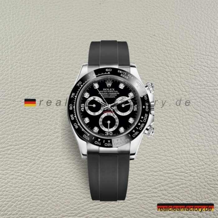 - Clean Factory’s Rolex Daytona 116519LN-0022 in white gold with a black moissanite diamond dial, Oysterflex strap, and black Cerachrom bezel delivers a bold, modern aesthetic few manufacturers can match. This build proves that contemporary materials and traditional craftsmanship can coexist beautifully.