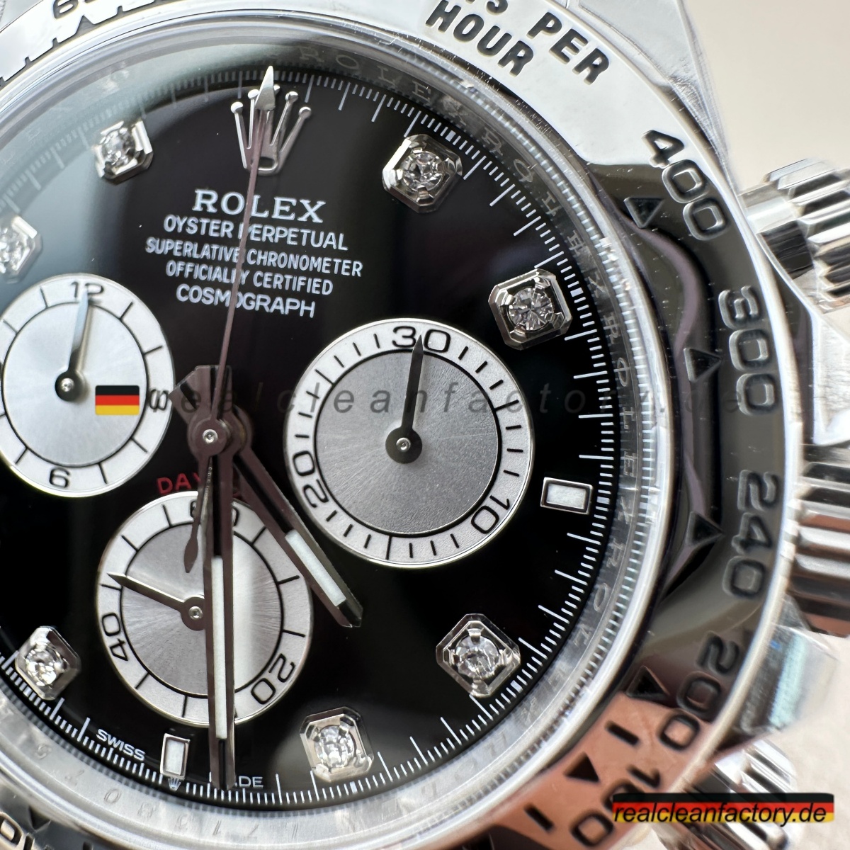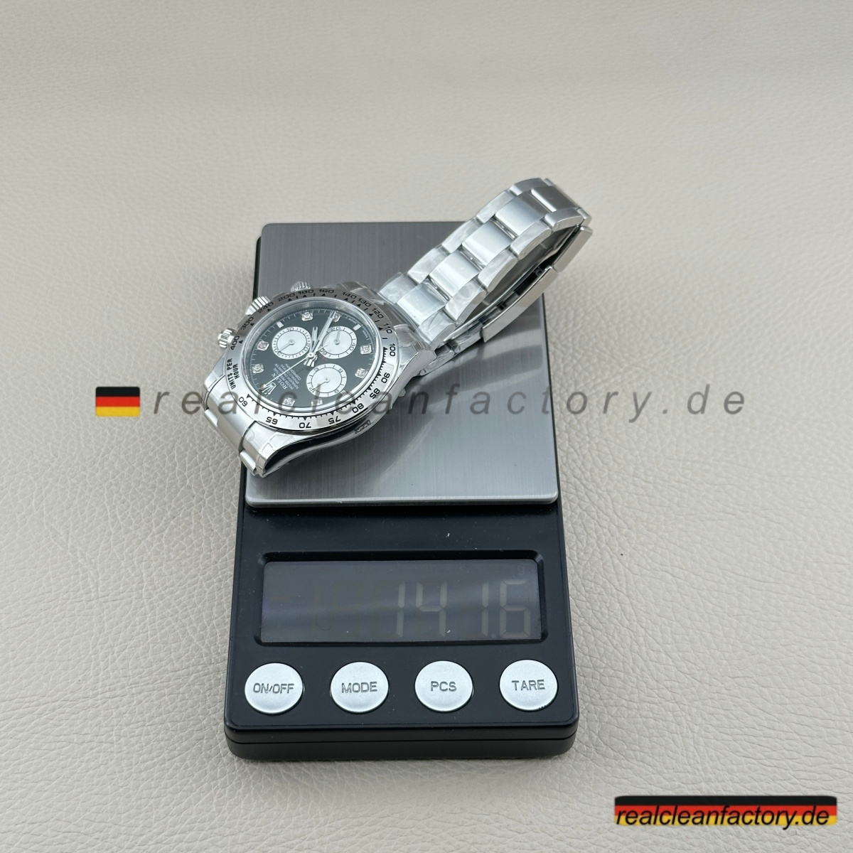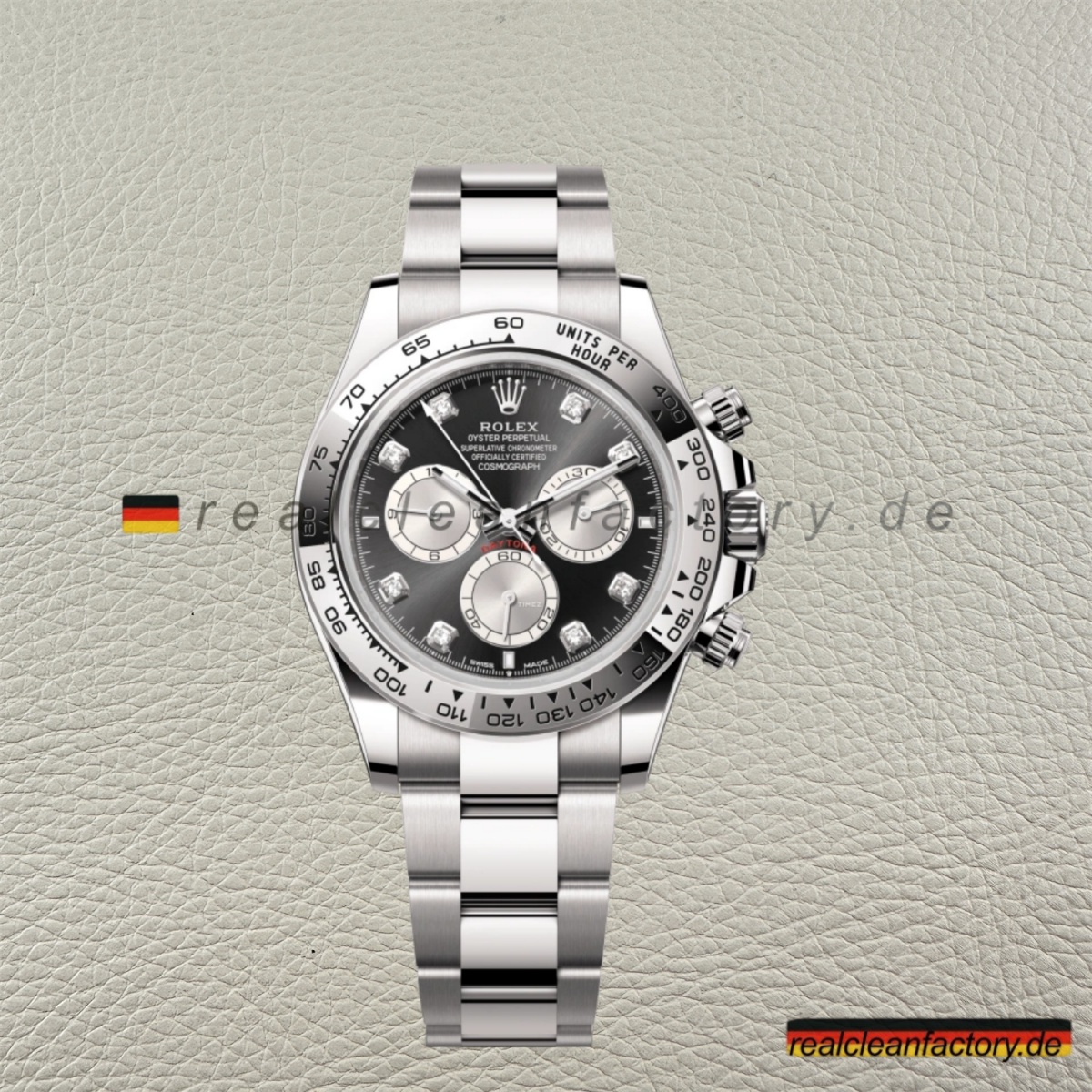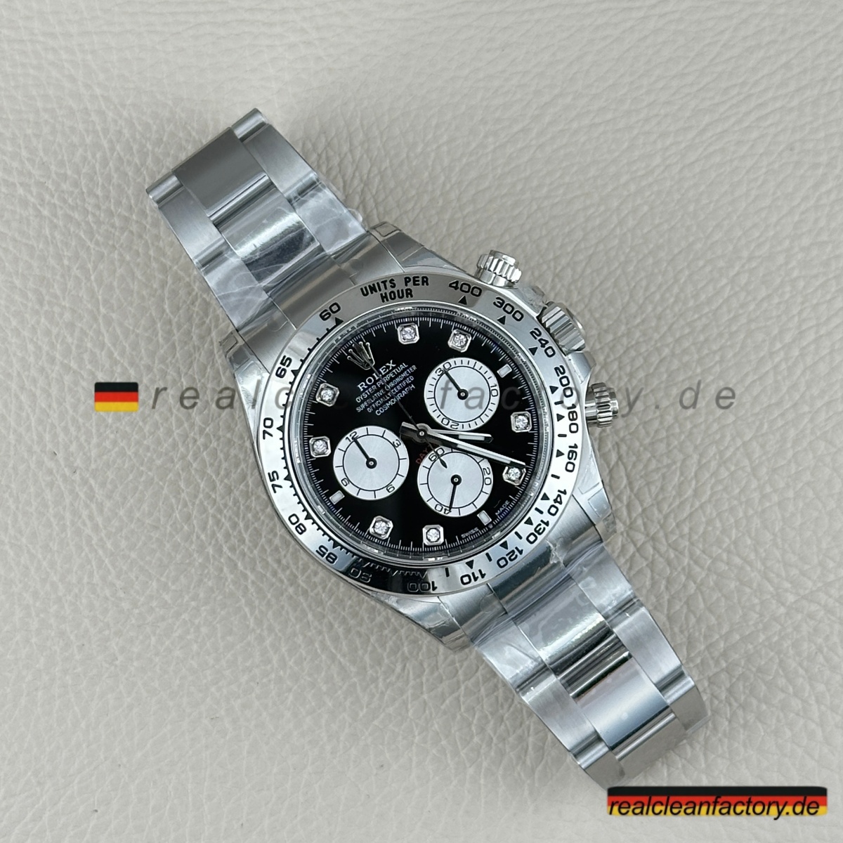 - Clean Factorys Rolex Daytona 126509-0002 zeigt, dass moderne Luxusuhren und Schweizer Präzision perfekt zusammenfinden können. Kühles Weißgold, tiefschwarzes Zifferblatt, strahlend silberne Totalisatoren und brillante Moissanit-Stundenmarker vereinen sich in einem Design, das sowohl dezent als auch kompromisslos opulent wirkt.