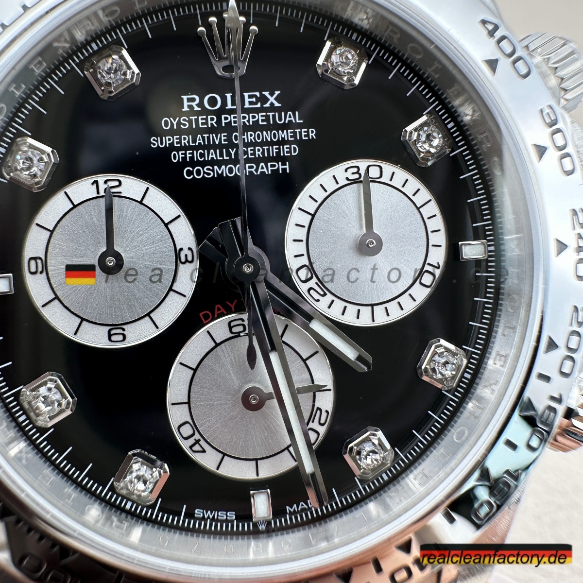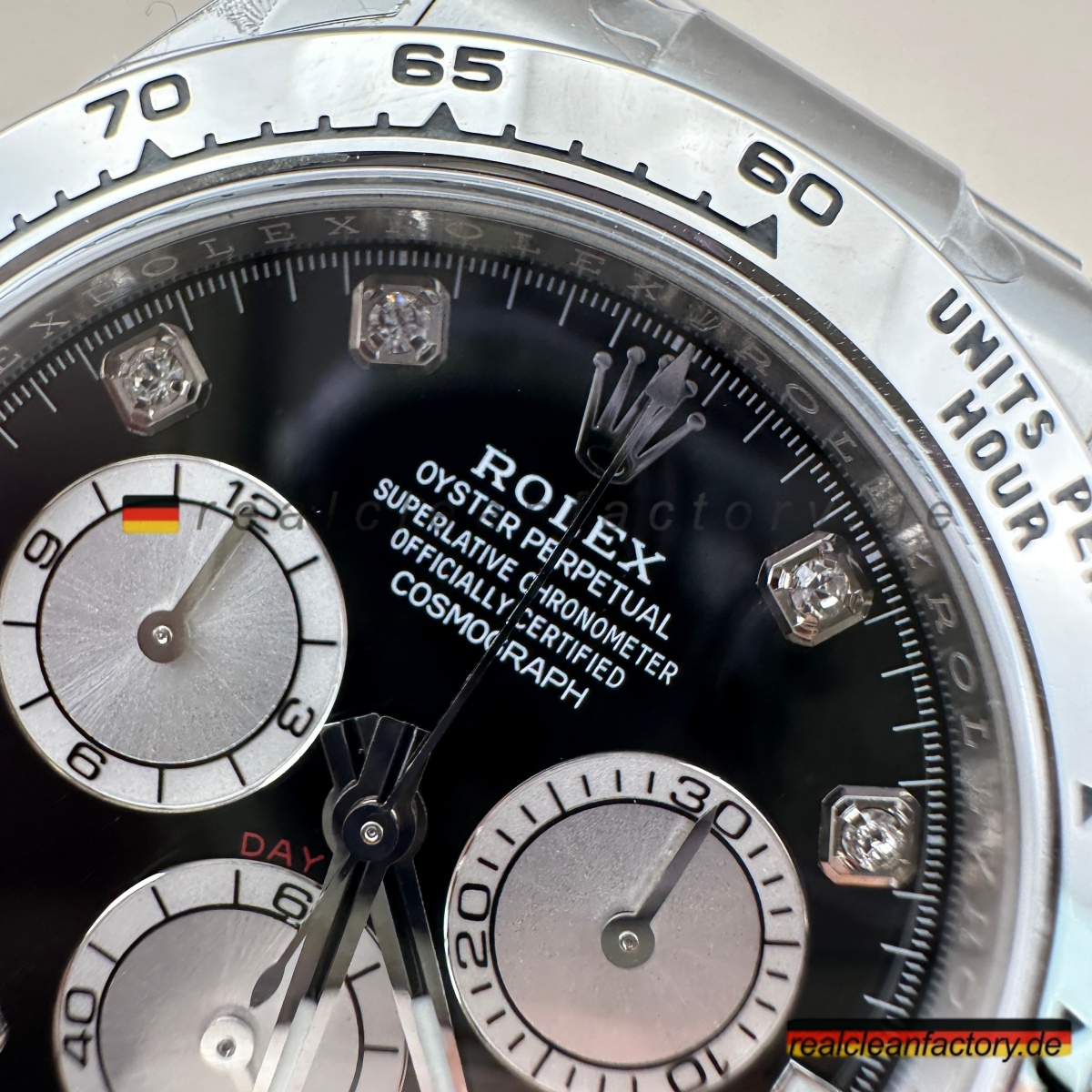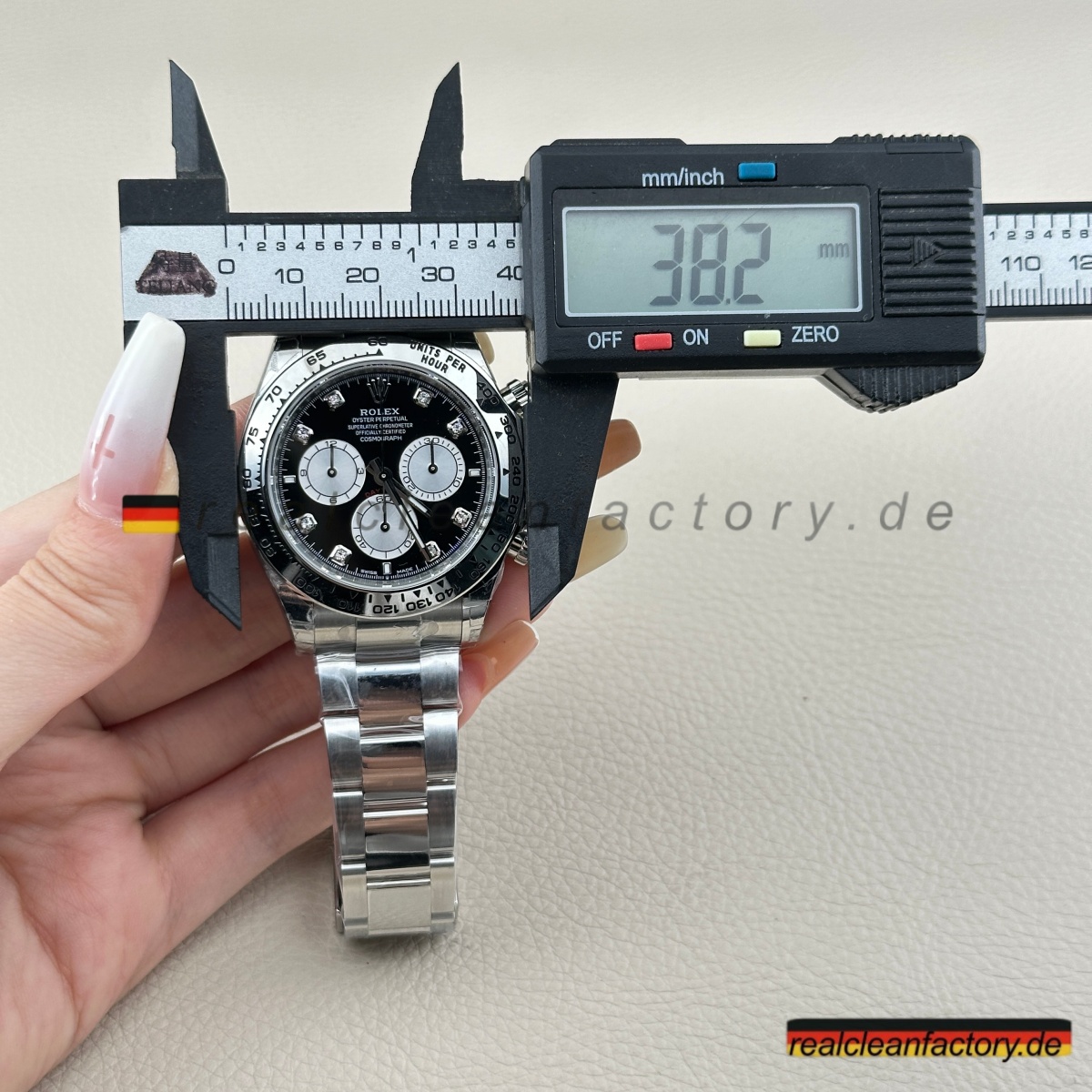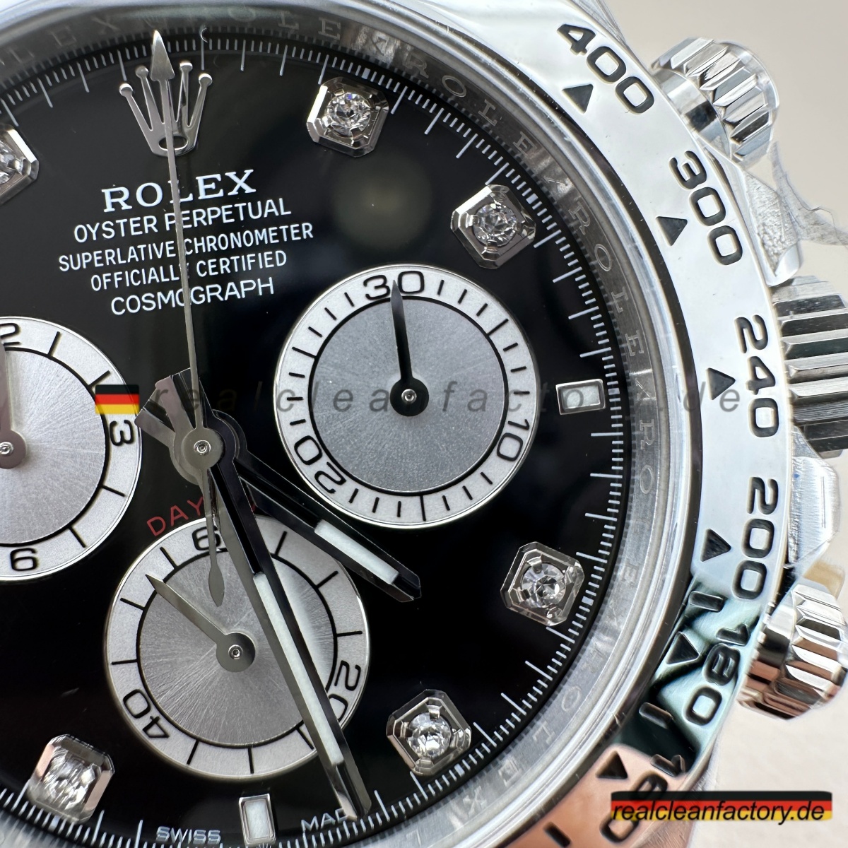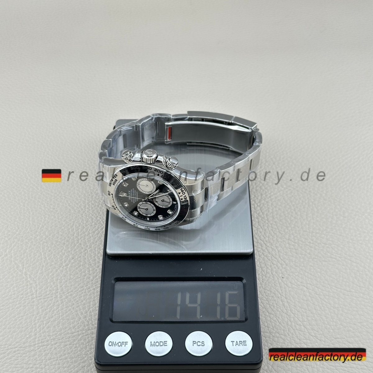 - Clean Factorys Rolex Daytona 126509-0002 zeigt, dass moderne Luxusuhren und Schweizer Präzision perfekt zusammenfinden können. Kühles Weißgold, tiefschwarzes Zifferblatt, strahlend silberne Totalisatoren und brillante Moissanit-Stundenmarker vereinen sich in einem Design, das sowohl dezent als auch kompromisslos opulent wirkt.