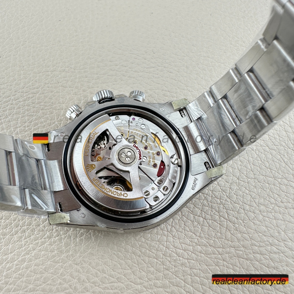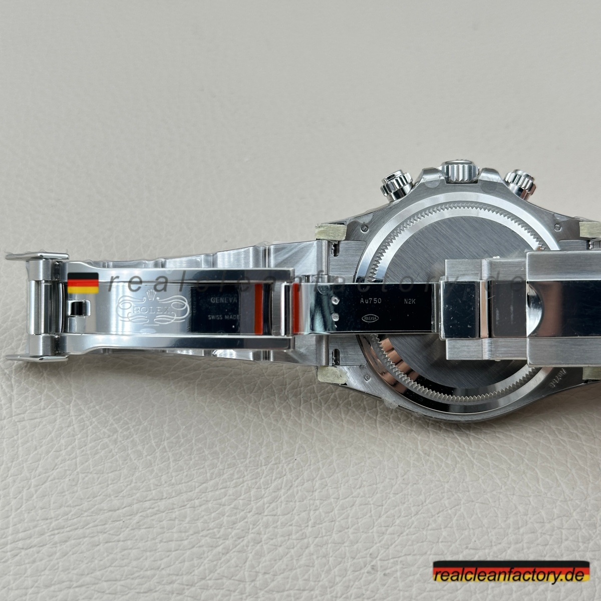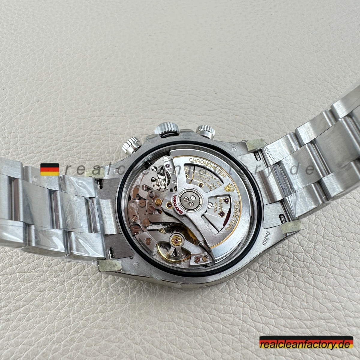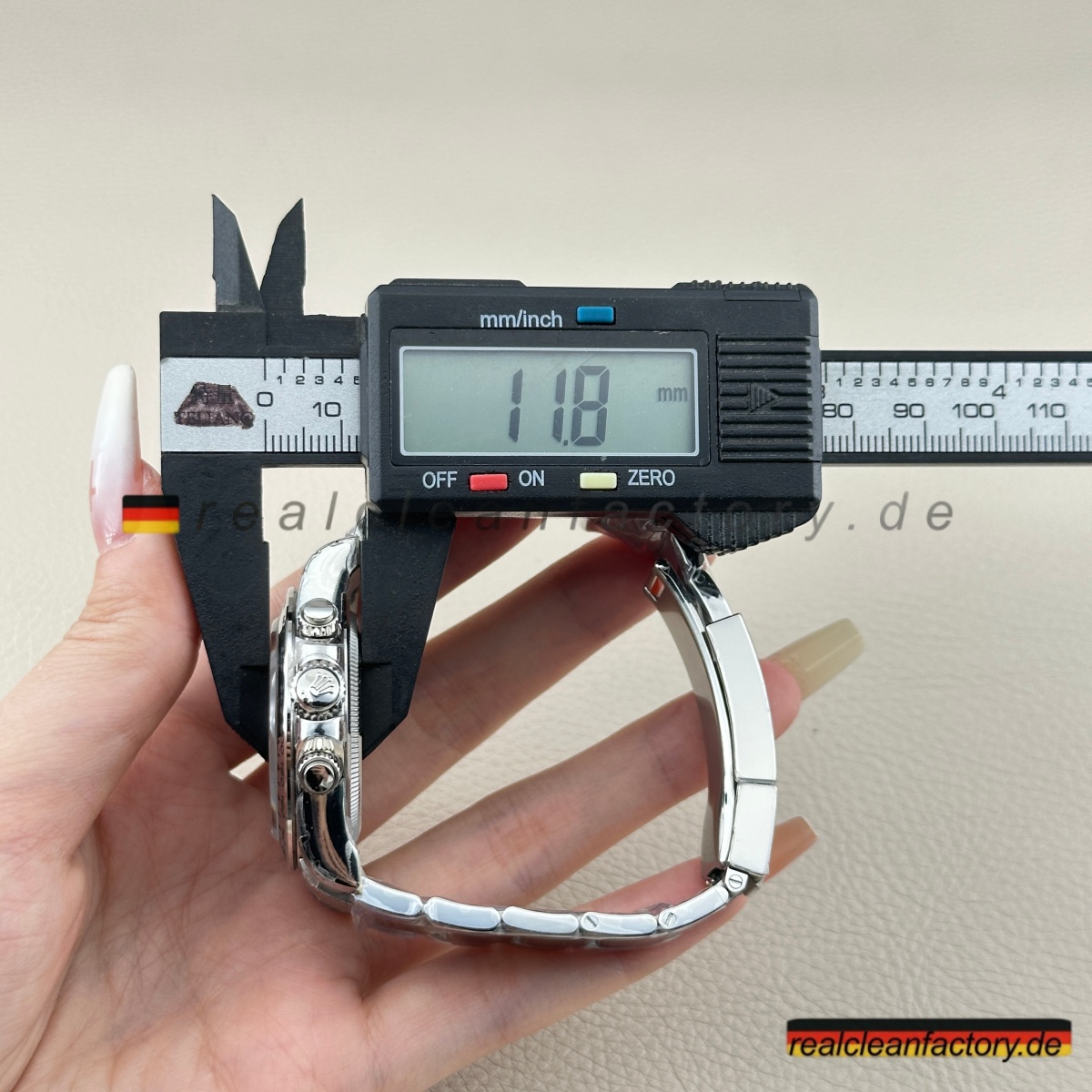 - Clean Factorys Rolex Daytona 126509-0002 zeigt, dass moderne Luxusuhren und Schweizer Präzision perfekt zusammenfinden können. Kühles Weißgold, tiefschwarzes Zifferblatt, strahlend silberne Totalisatoren und brillante Moissanit-Stundenmarker vereinen sich in einem Design, das sowohl dezent als auch kompromisslos opulent wirkt.