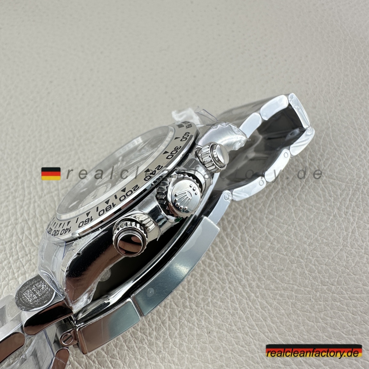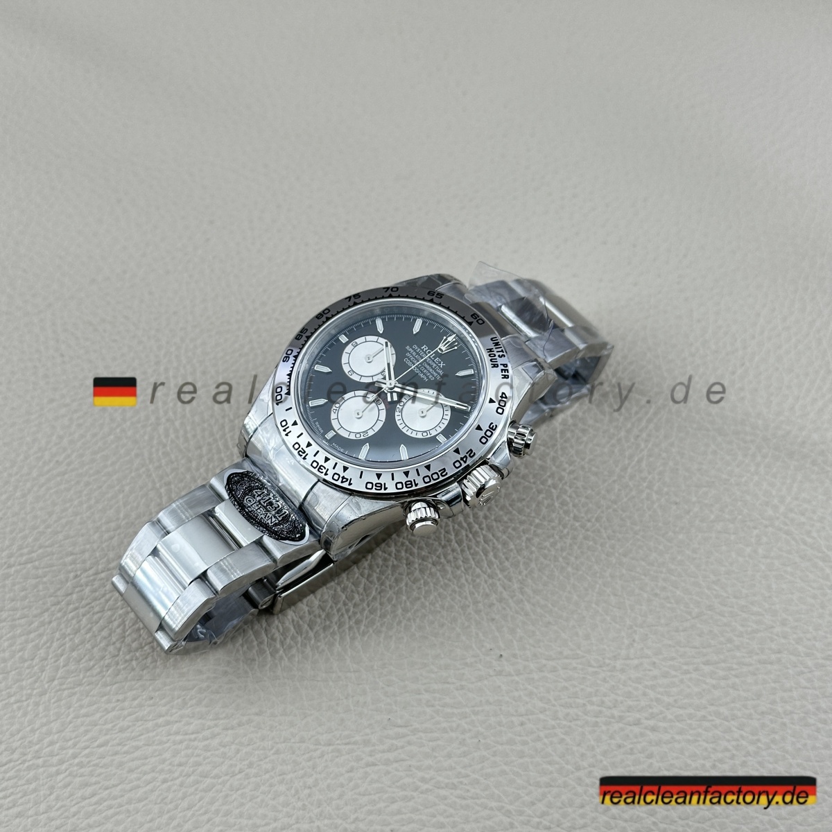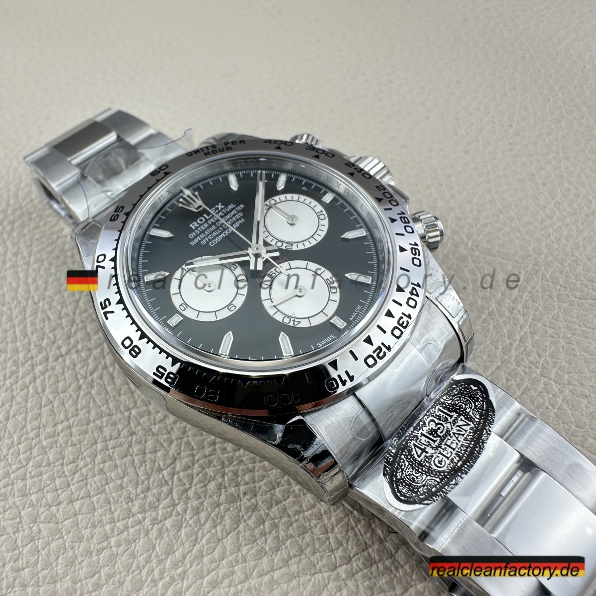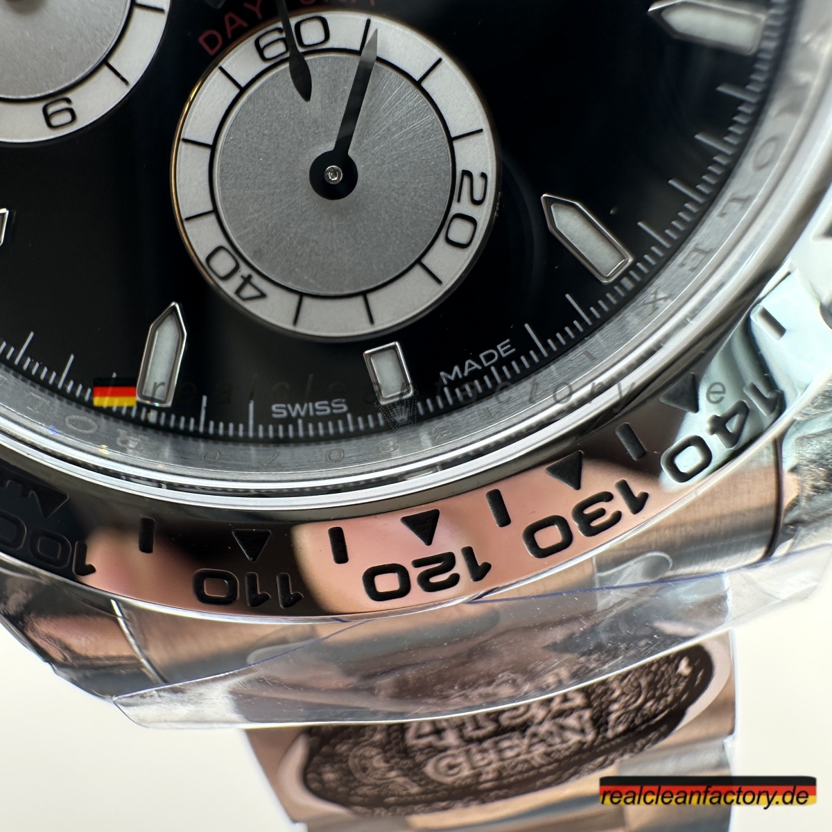 • Clean Factorys Rolex Daytona bester Clone in Weißgold mit schwarzem Zifferblatt und silbernen Totalisatoren repräsentiert die neue Generation der Daytona-Exzellenz. Dies ist die aktualisierte Referenz, die Rolex eingeführt hat, um die alte Version veraltet wirken zu lassen – Weißgoldgehäuse, schwarzes Zifferblatt und nun mit markanten silbernen Totalisatoren, die die Optik dramatisch aufwerten. Es ist nicht nur anders – es ist besser, mit verbesserter Ablesbarkeit und einer noch raffinierteren Ästhetik.