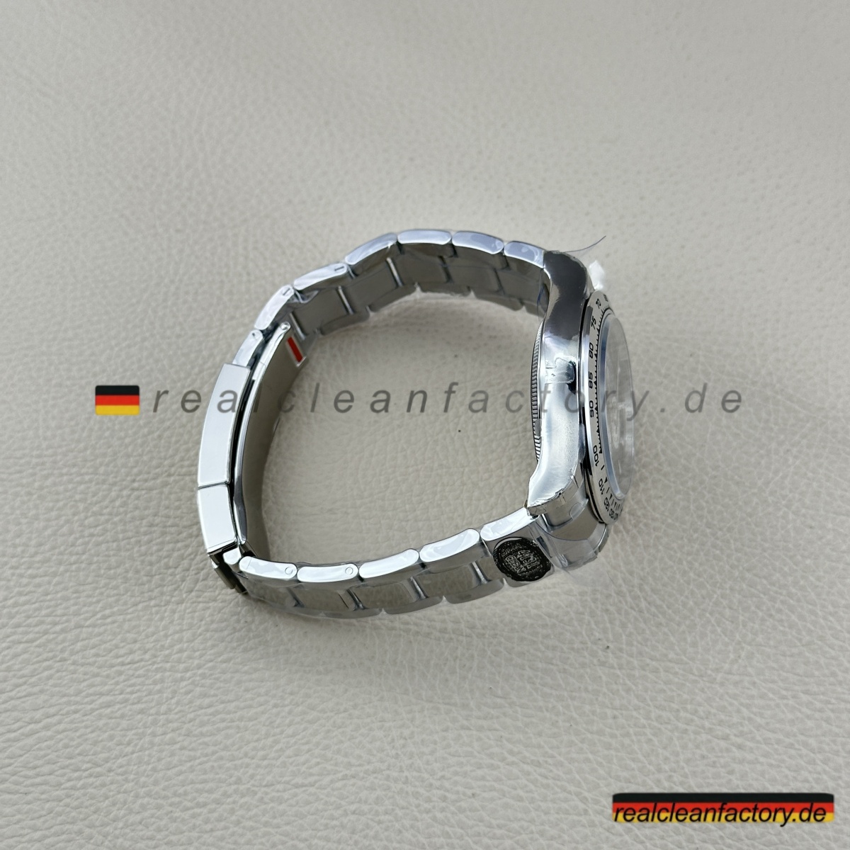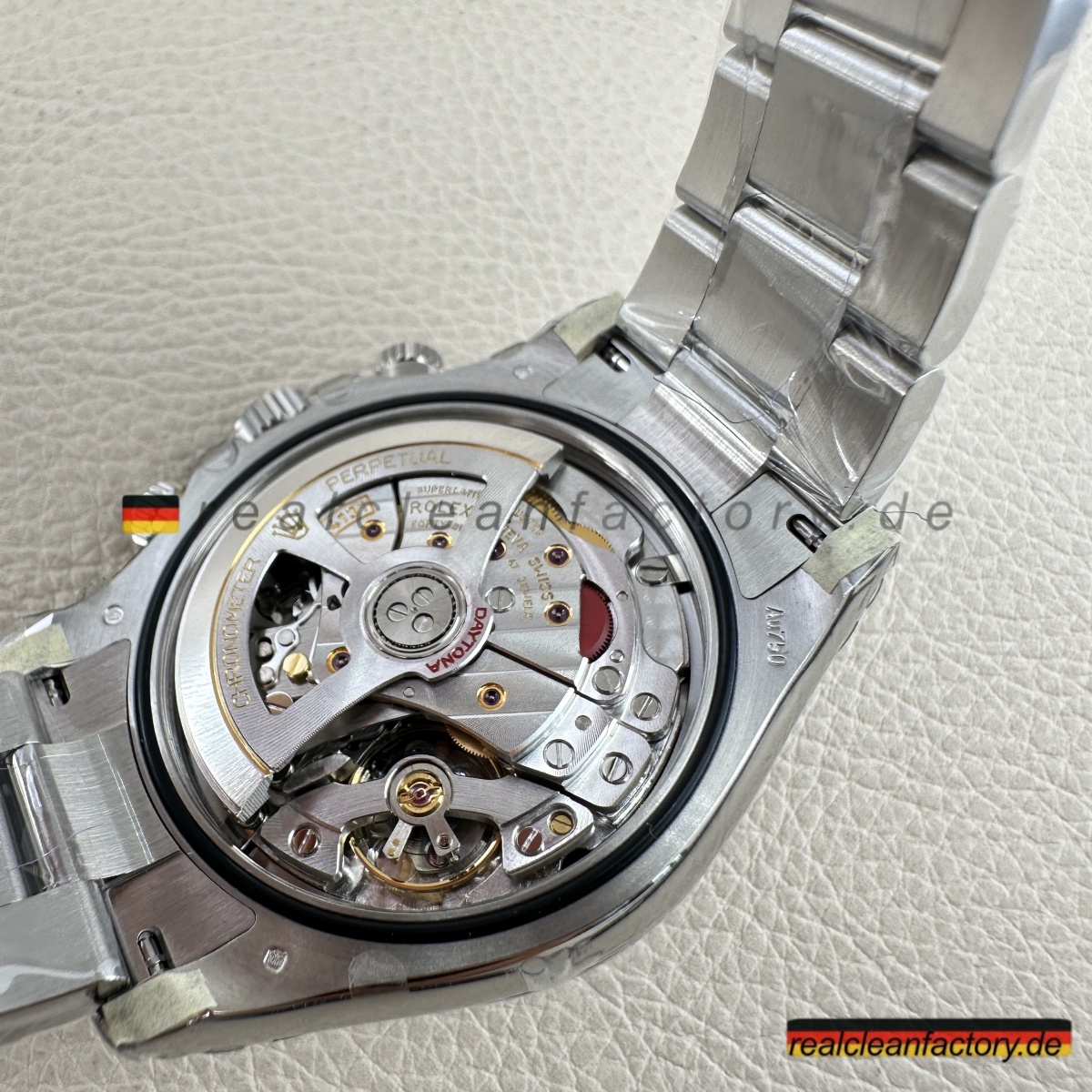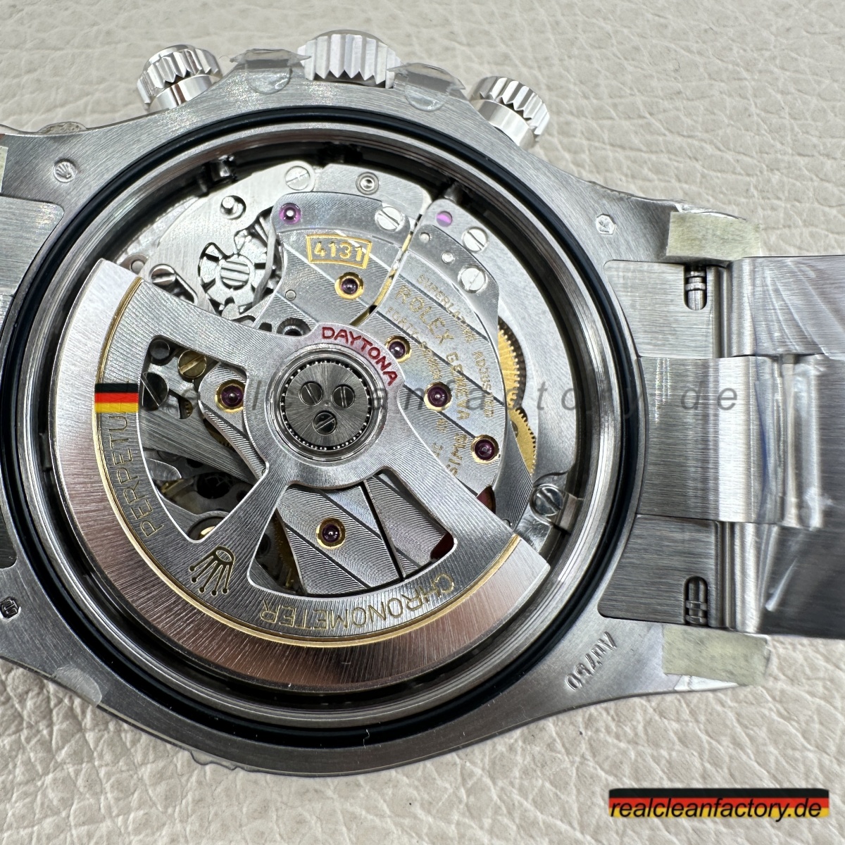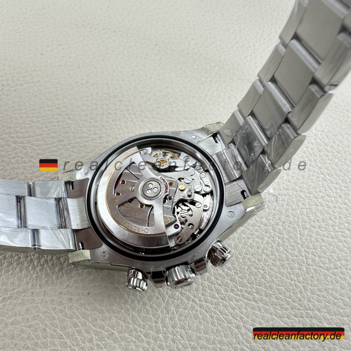 • Wo sich diese Daytona wirklich absetzt, ist das brandneue Dandong 4131 Uhrwerk. Im Gegensatz zu älteren 7750-basierten Clones handelt es sich hier um einen echten Säulenrad-Chronographen mit vertikaler Kupplung, der ein präzises, knackiges Drücker-Gefühl und eine Gangreserve von 72 Stunden bietet. Die Chronergy-Hemmung steigert die Effizienz um 15 % und sorgt für Zuverlässigkeit und gleichbleibende Präzision. Das sanfte Aufziehen und das präzise Zurücksetzen des Chronographen sind vom echten Rolex-Erlebnis nicht zu unterscheiden.