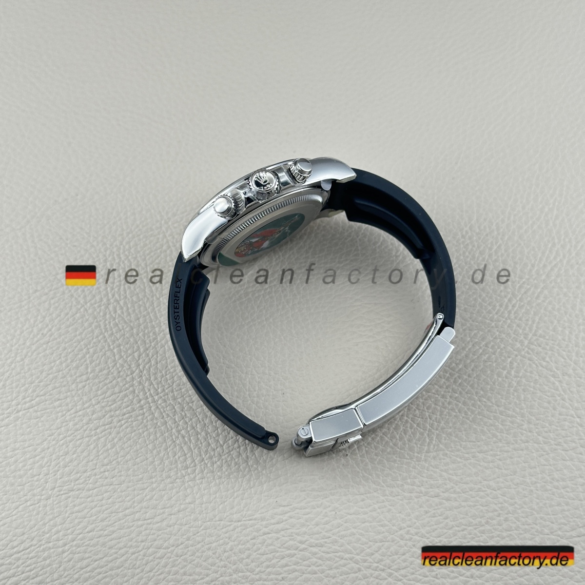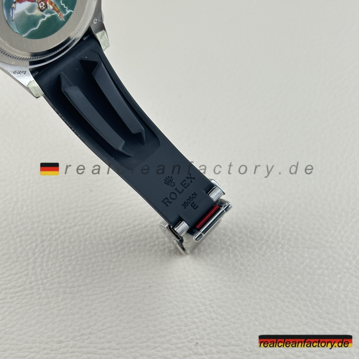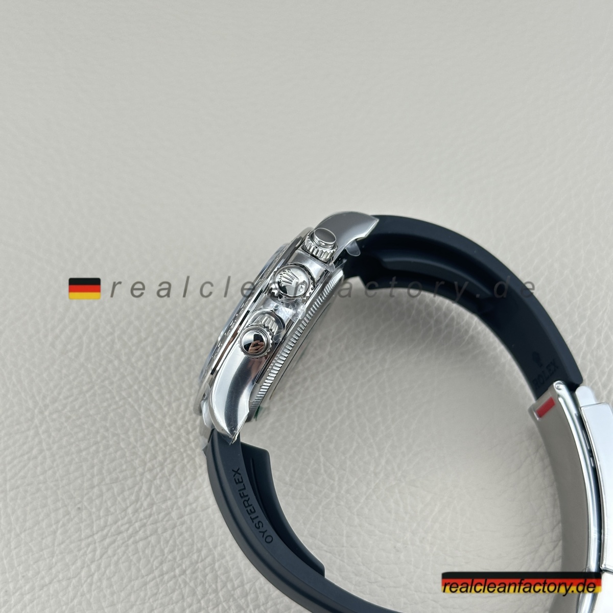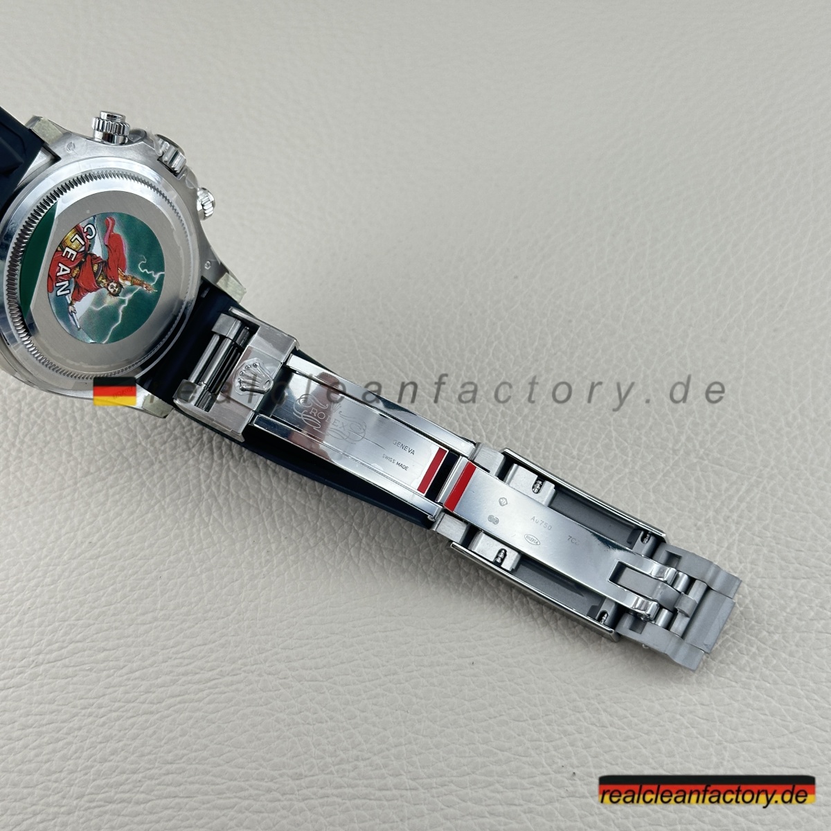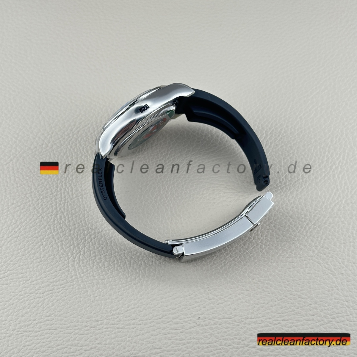 - Clean Factory bezieht echtes Schweiz-importiertes Oysterflex mit der echten Metallklinge und D, E, F Größen-Kombinationssystem. Das Ding biegt und bewegt sich wie ein Teil deines Handgelenks, aber mit der strukturellen Integrität, die es substanziell fühlen lässt. Die weißgold-umhüllte Oysterlock-Schließe klickt mit diesem perfekten Widerstand, der Authentizität schreit.