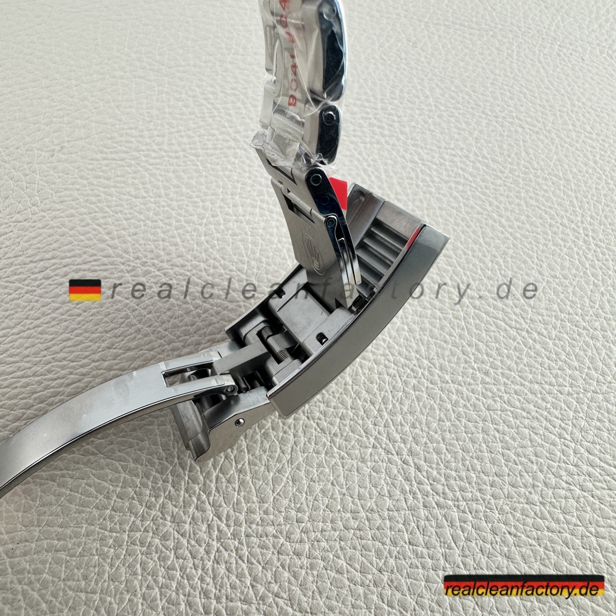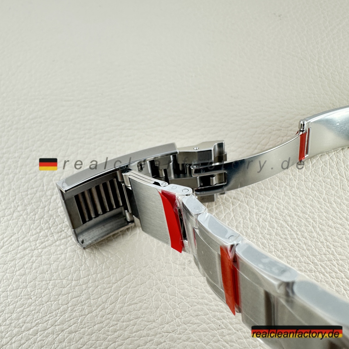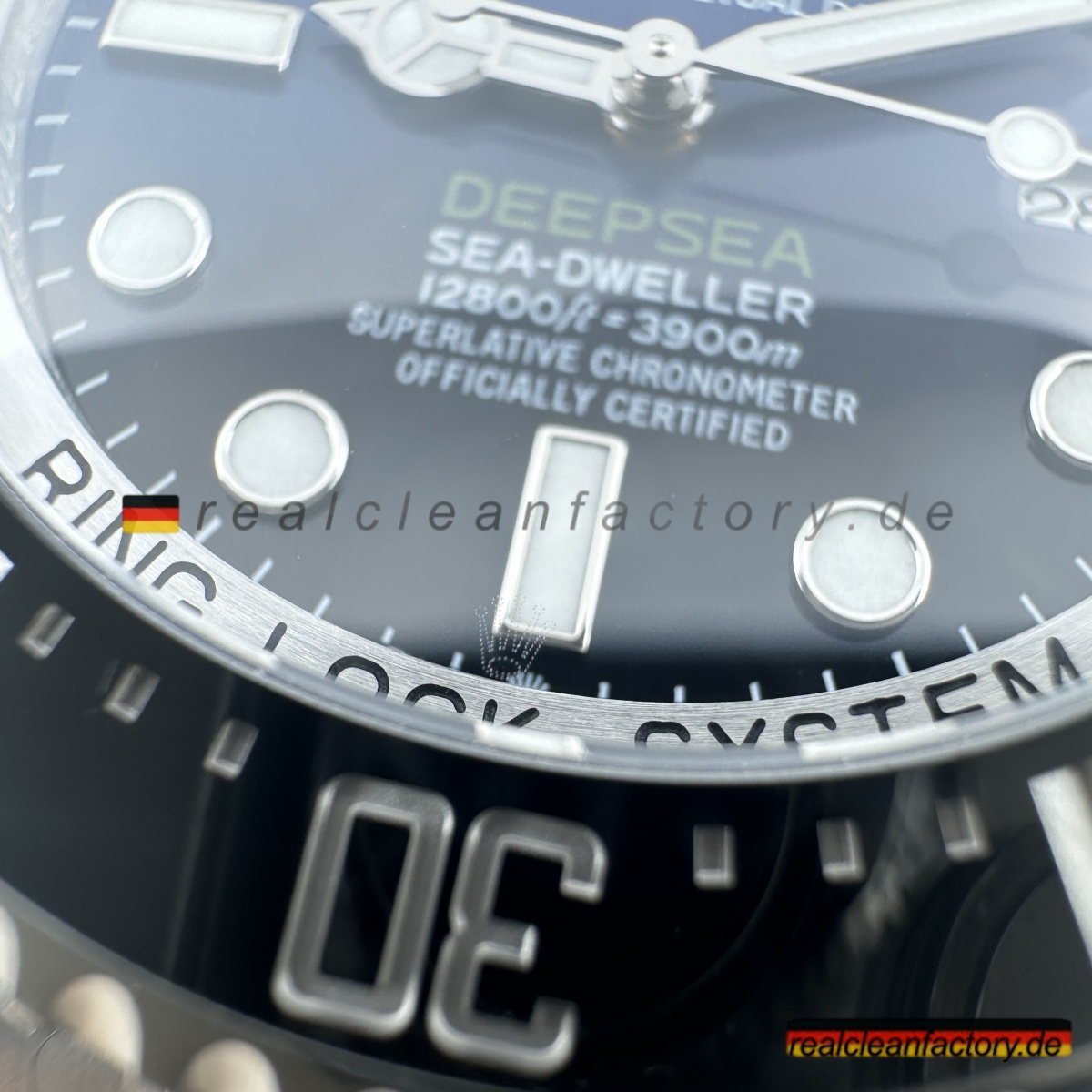 - Die Keramiklünette ist speziell für die Deepsea konzipiert. Das größere Inlay passt zum gewölbten Glas, die platinverfüllten Ziffern sind groß für maximale Ablesbarkeit. Clean Factory setzt dies makellos um: kratzfeste Keramik, präzise Ziffern, perfekt ausgerichtet, 60 Klicks in einer Richtung mit exakt dem Gefühl des Originals.
