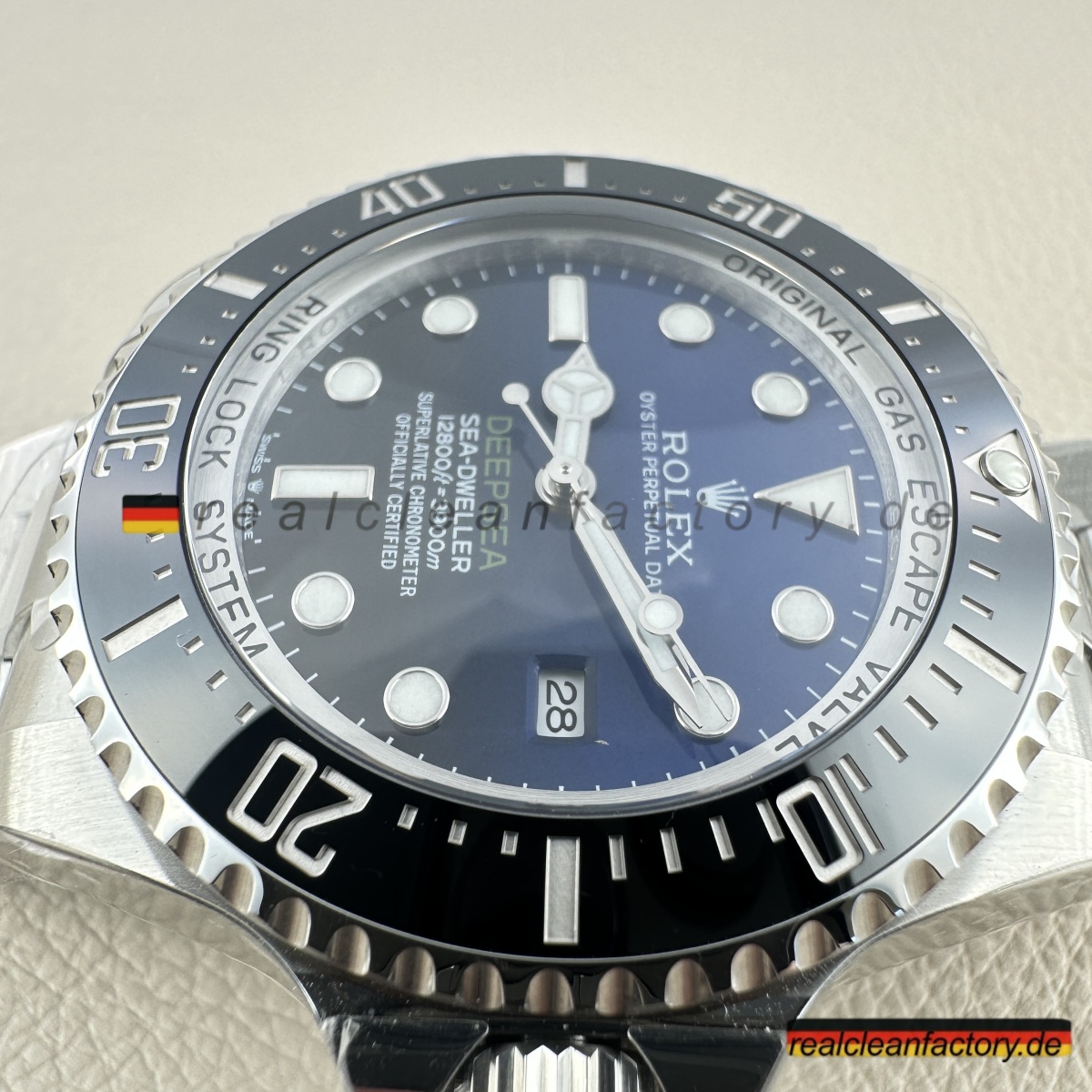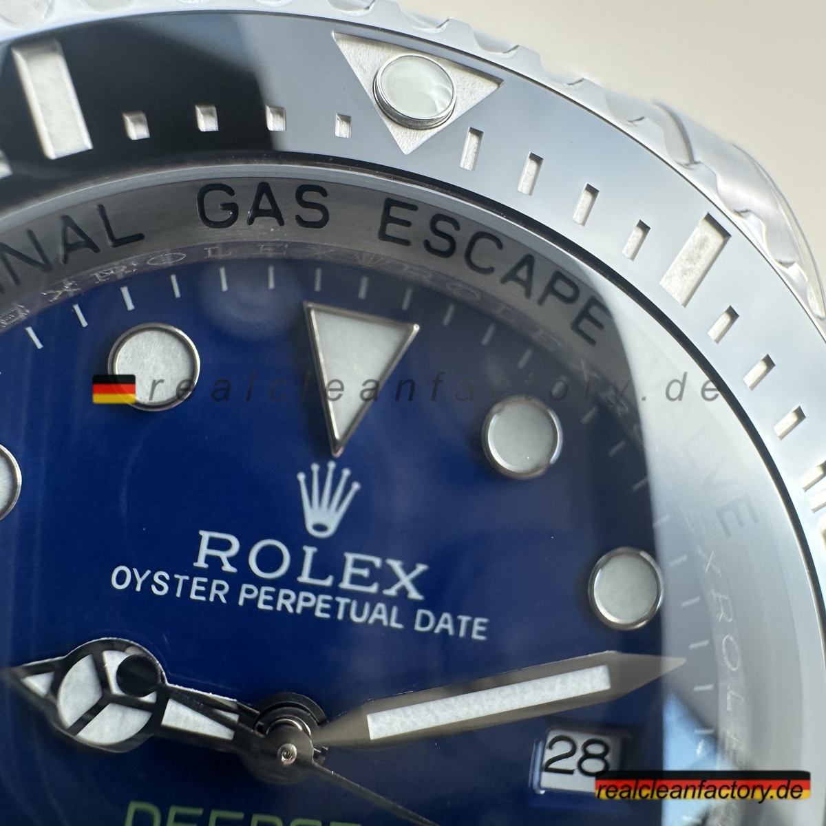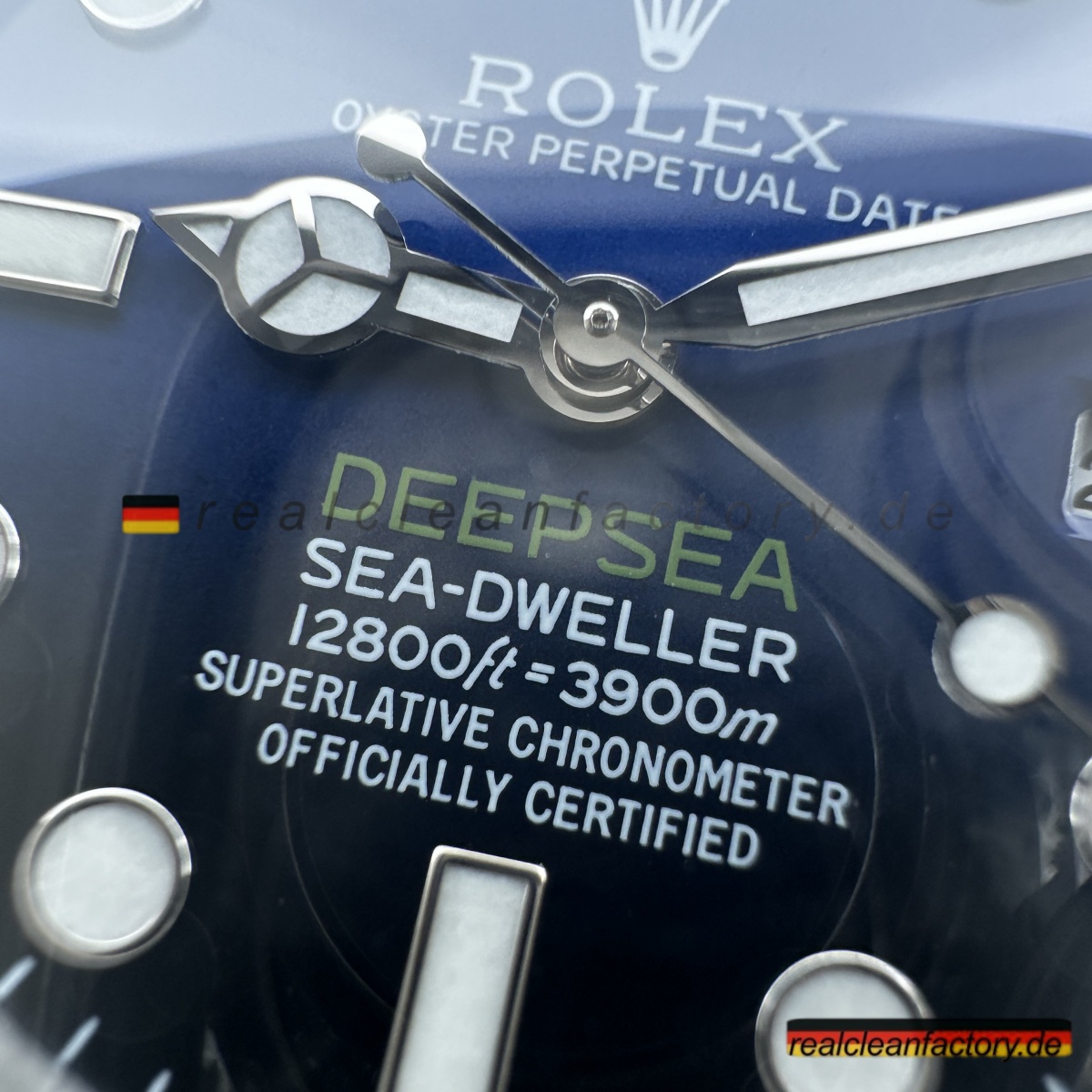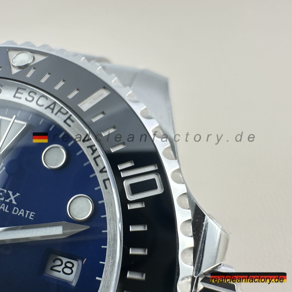 - Das D-Blue Zifferblatt macht diese Deepsea einzigartig. Es startet oben in tiefem Ozeanblau und geht nach unten nahtlos in Schwarz über – eine Hommage an den Abstieg ins tiefste Meer. Clean Factory hat monatelang an diesem komplexen Farbverlauf gearbeitet: keine einfache Verlaufsdrucktechnik, sondern ein vielschichtiger Prozess, der den originalen Rolex-Übergang perfekt nachbildet. Viele Hersteller können diesen Effekt nicht einmal ansatzweise erreichen, da er echtes Schweizer Equipment und Know-how erfordert.