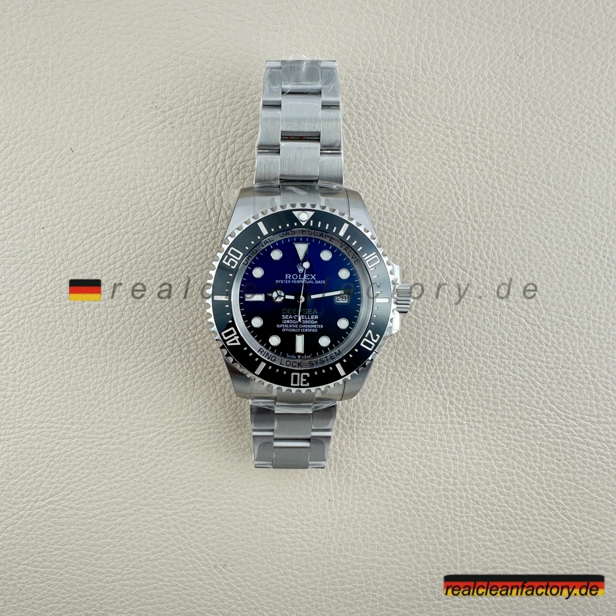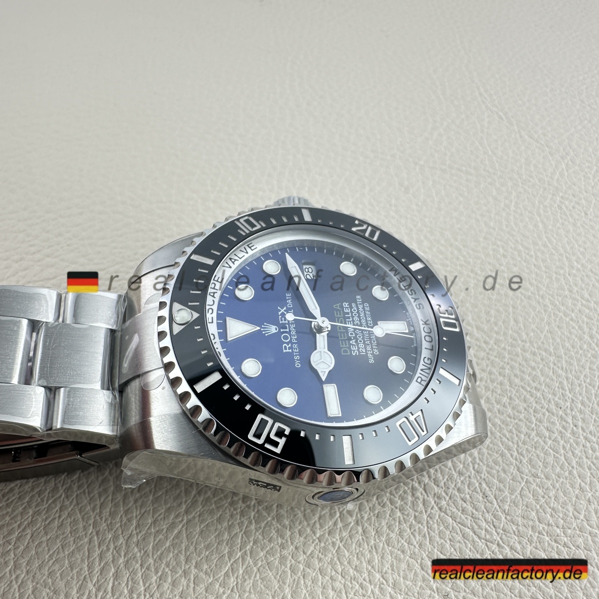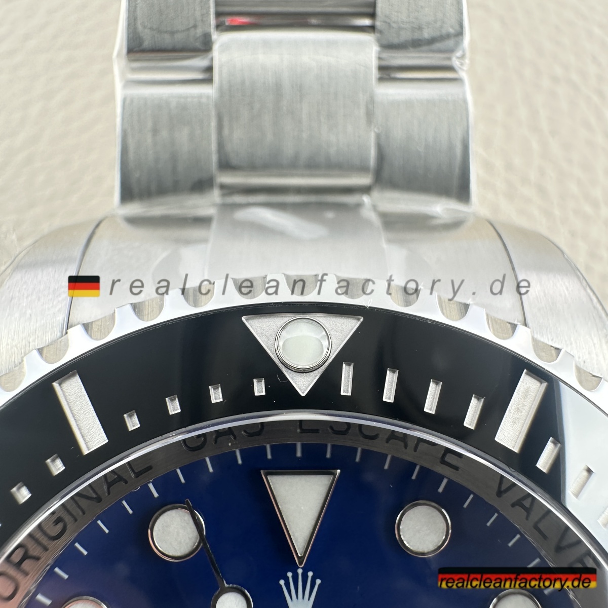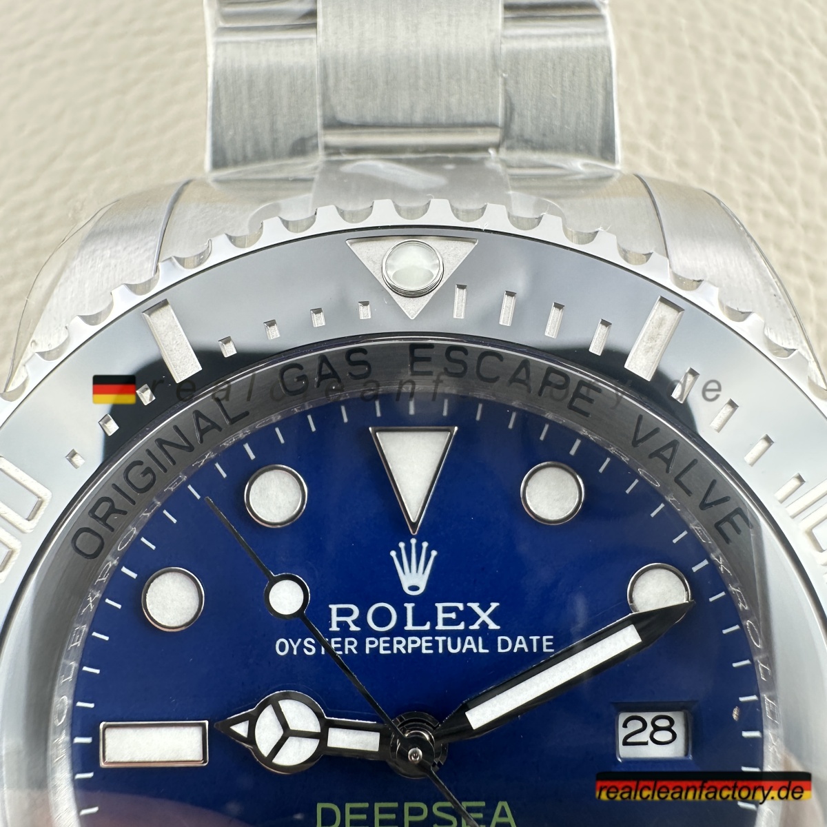 - Das D-Blue Zifferblatt macht diese Deepsea einzigartig. Es startet oben in tiefem Ozeanblau und geht nach unten nahtlos in Schwarz über – eine Hommage an den Abstieg ins tiefste Meer. Clean Factory hat monatelang an diesem komplexen Farbverlauf gearbeitet: keine einfache Verlaufsdrucktechnik, sondern ein vielschichtiger Prozess, der den originalen Rolex-Übergang perfekt nachbildet. Viele Hersteller können diesen Effekt nicht einmal ansatzweise erreichen, da er echtes Schweizer Equipment und Know-how erfordert.