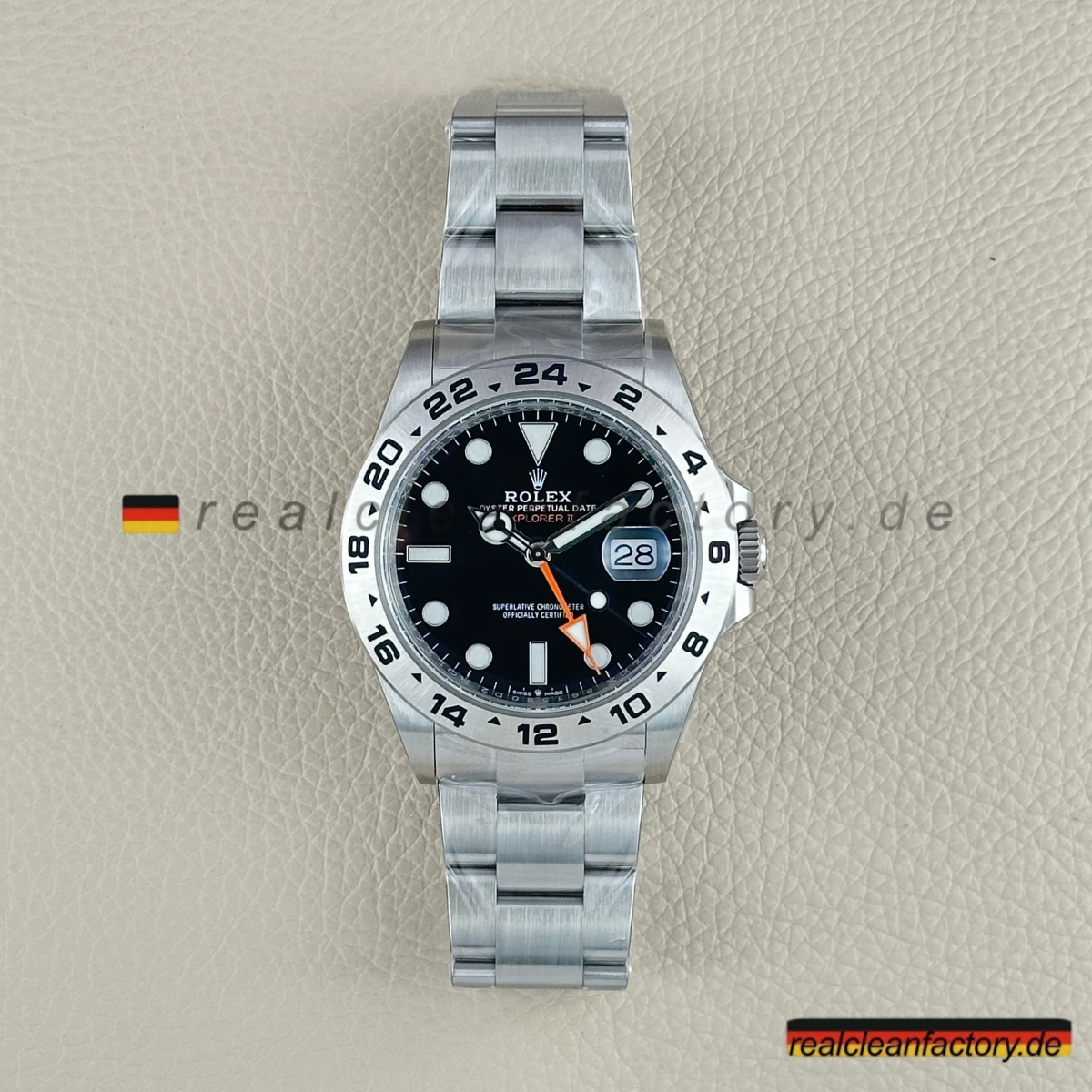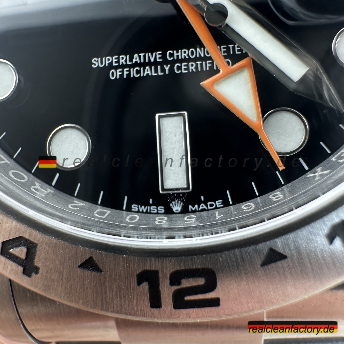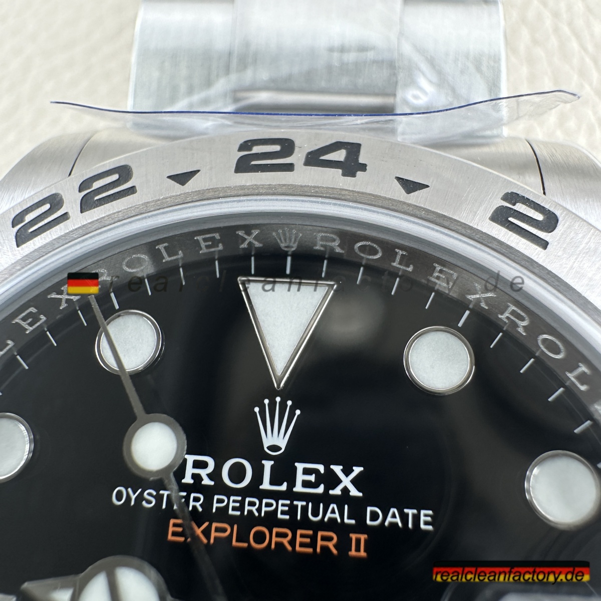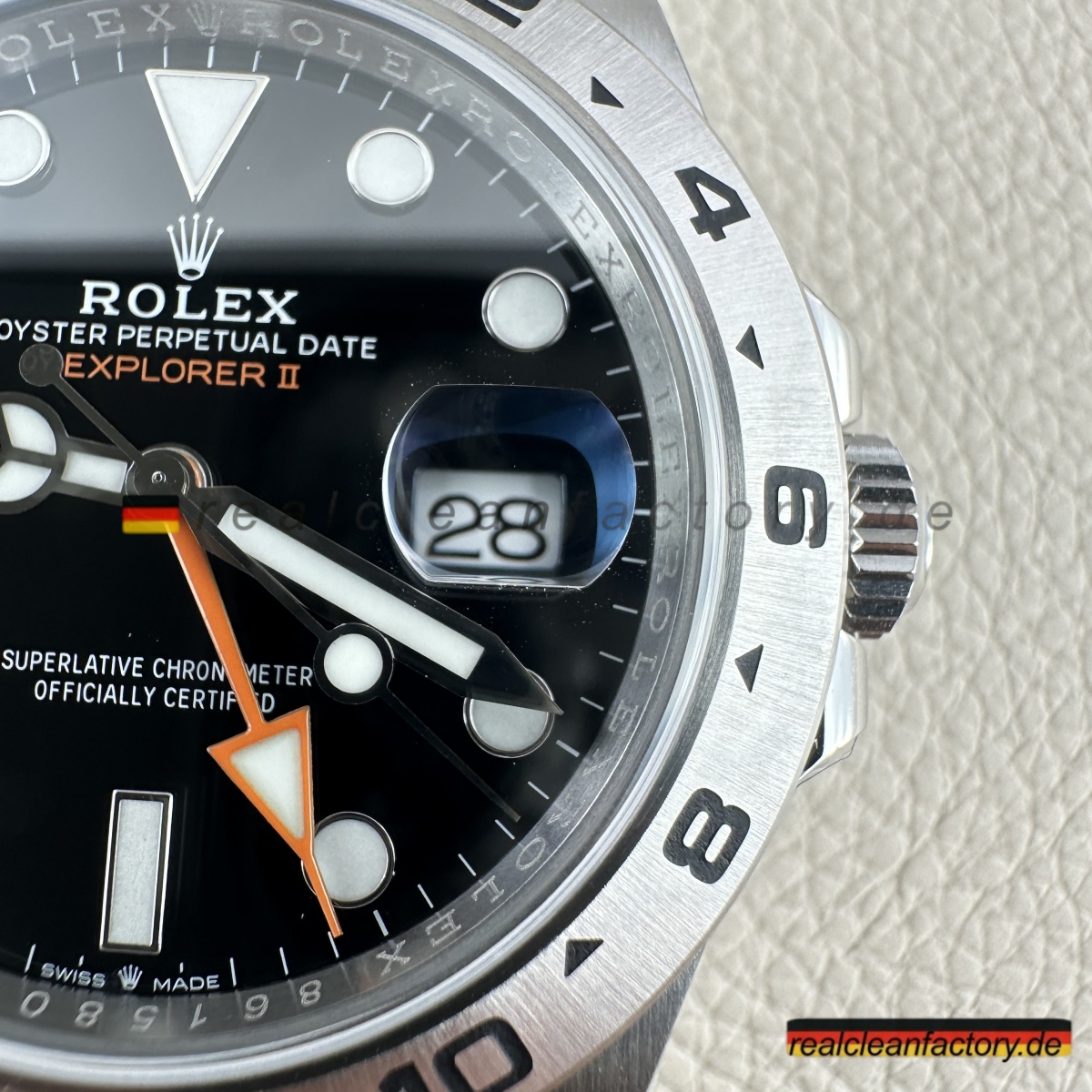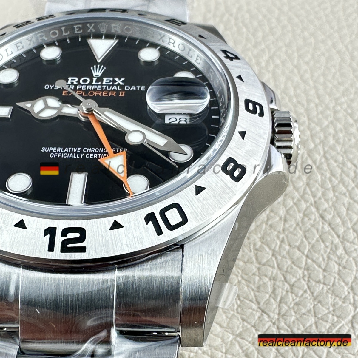 - „EXPLORER II“-Schriftzug in der Original-Schriftart und dem korrekten Orangeton