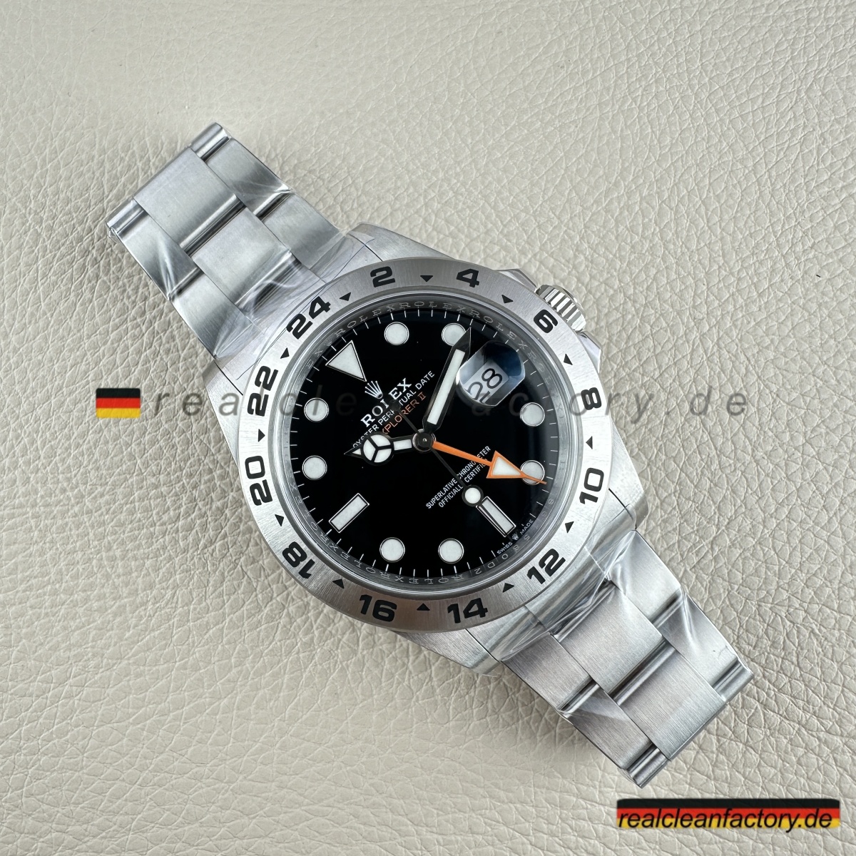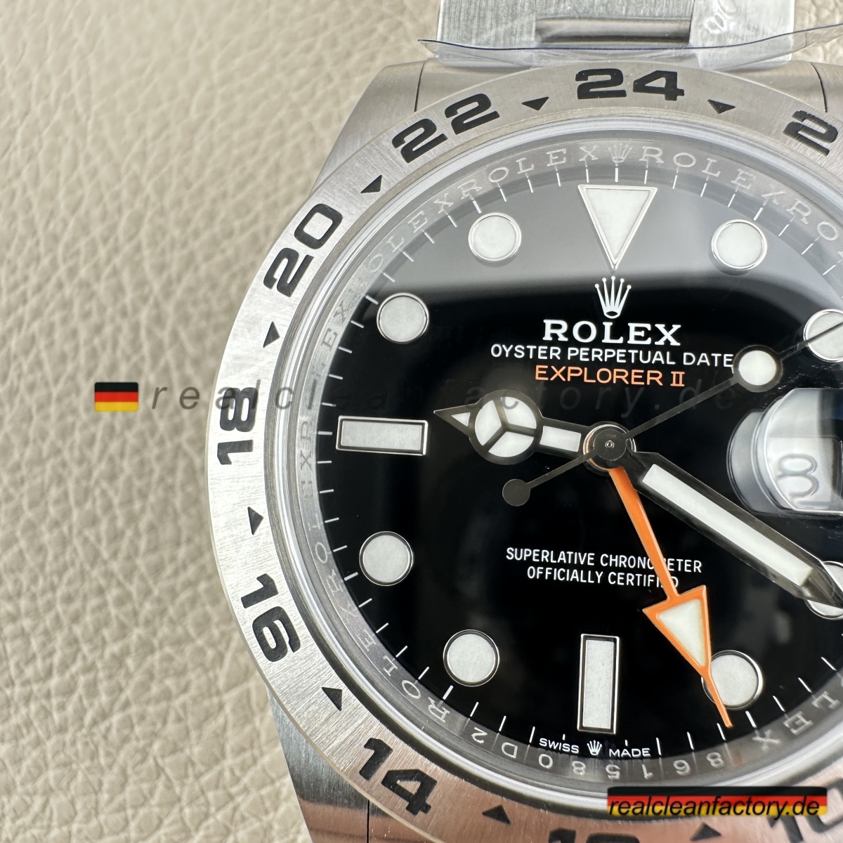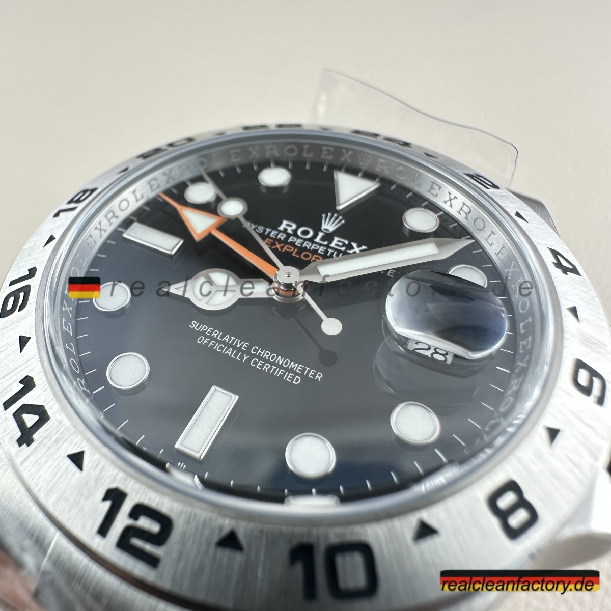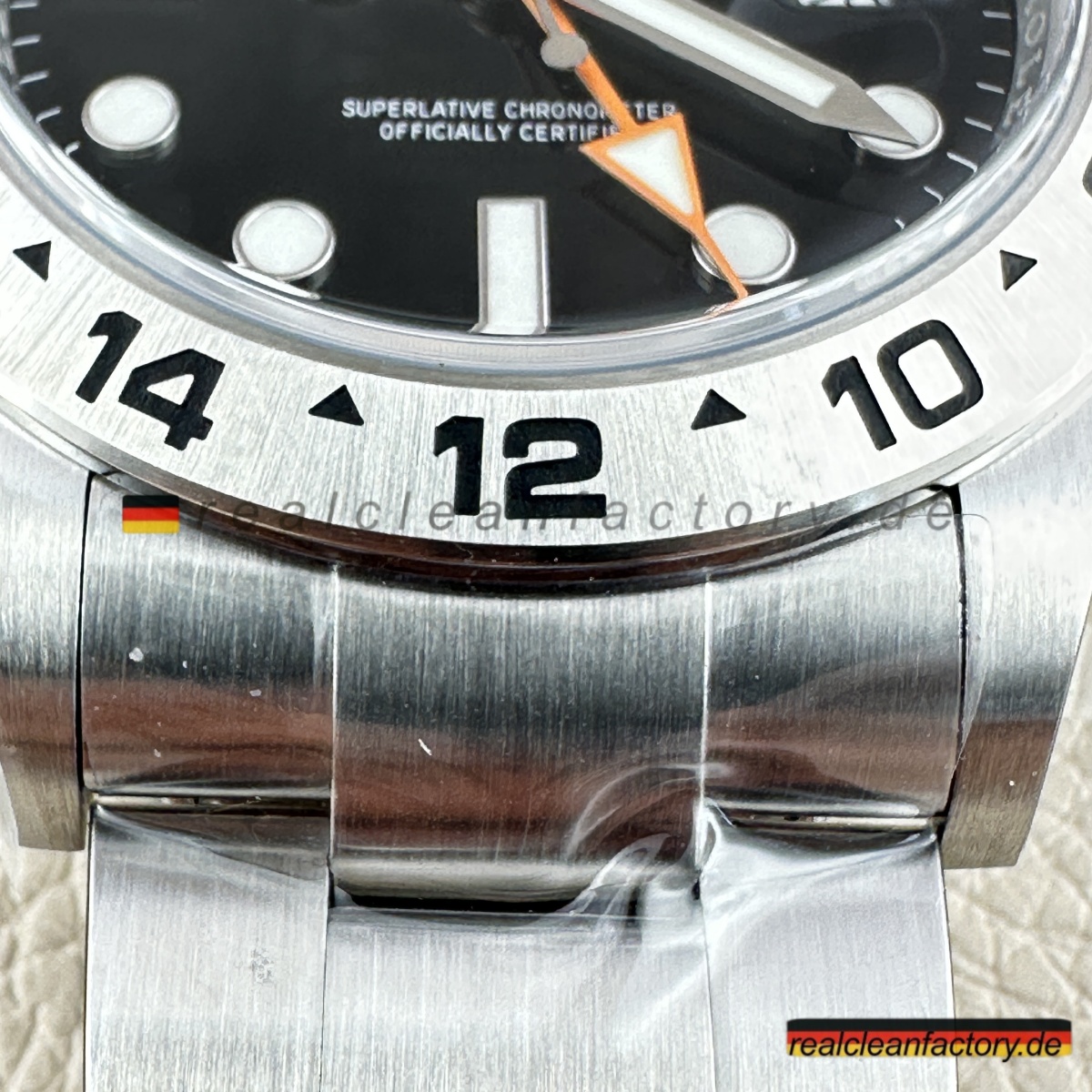 - „EXPLORER II“-Schriftzug in der Original-Schriftart und dem korrekten Orangeton