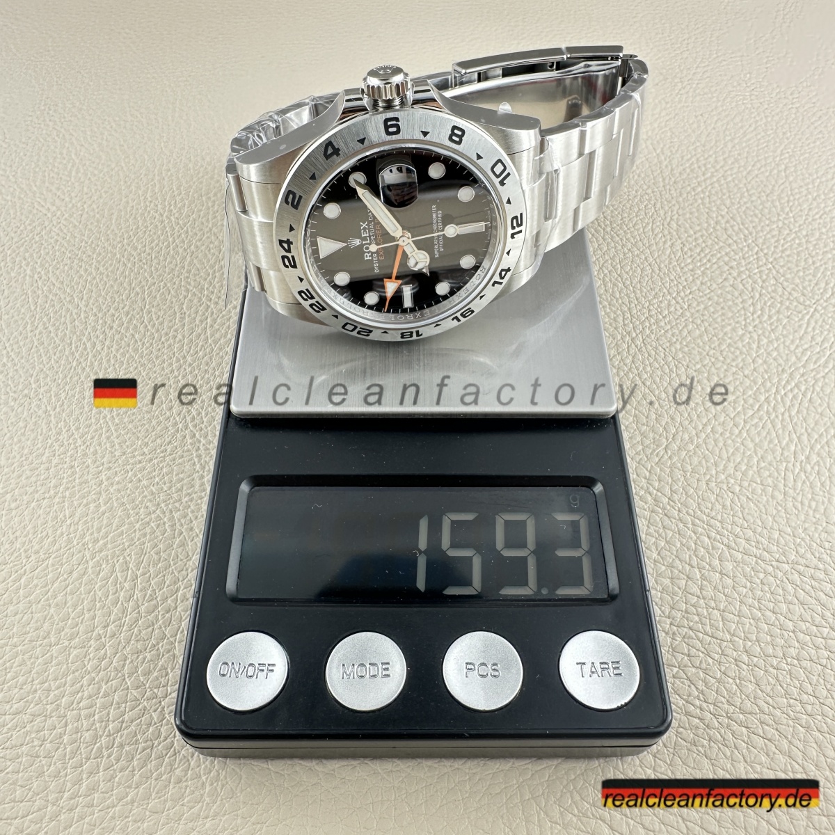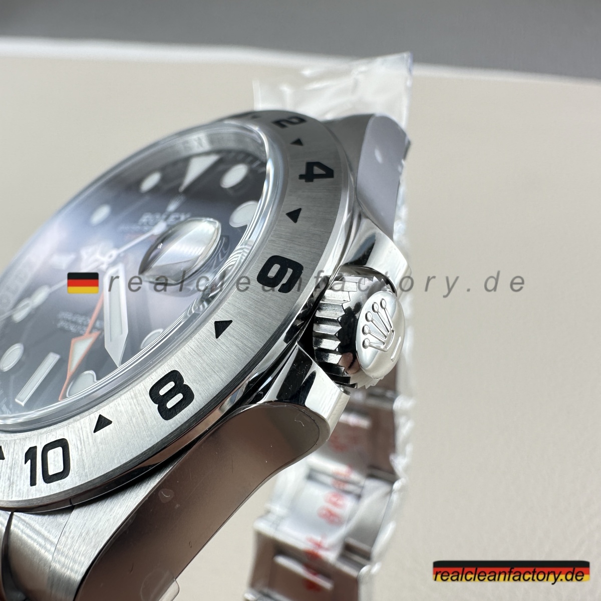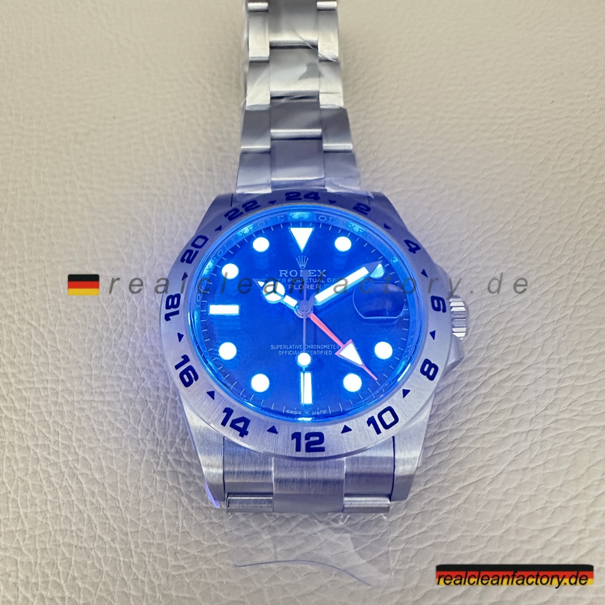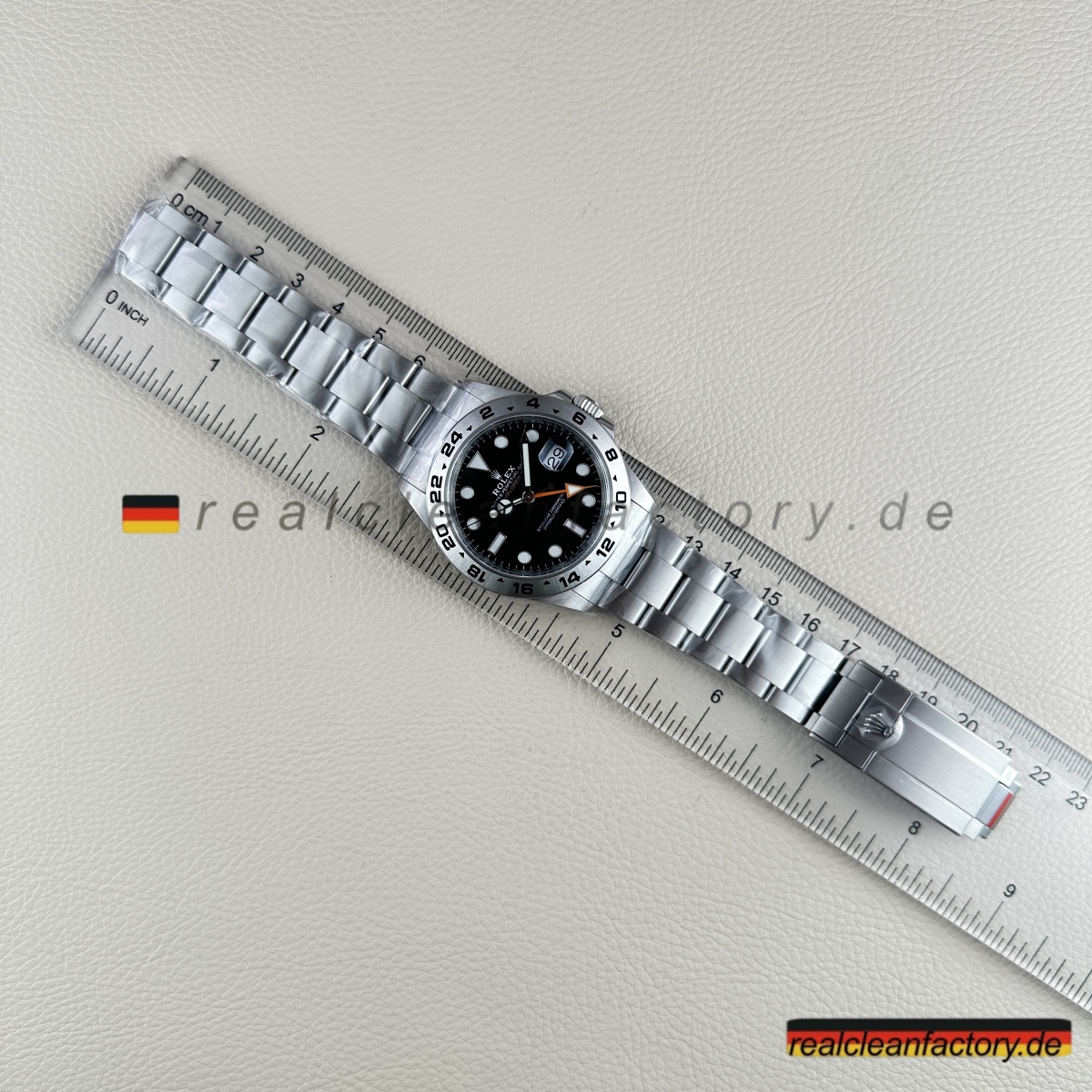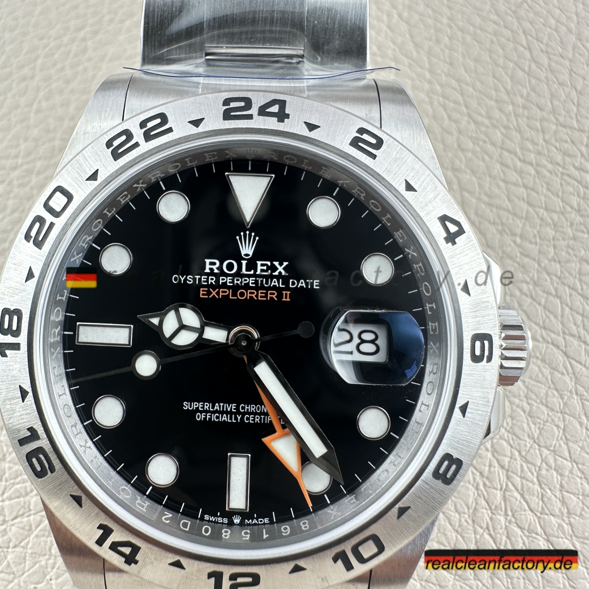 - „EXPLORER II“-Schriftzug in der Original-Schriftart und dem korrekten Orangeton