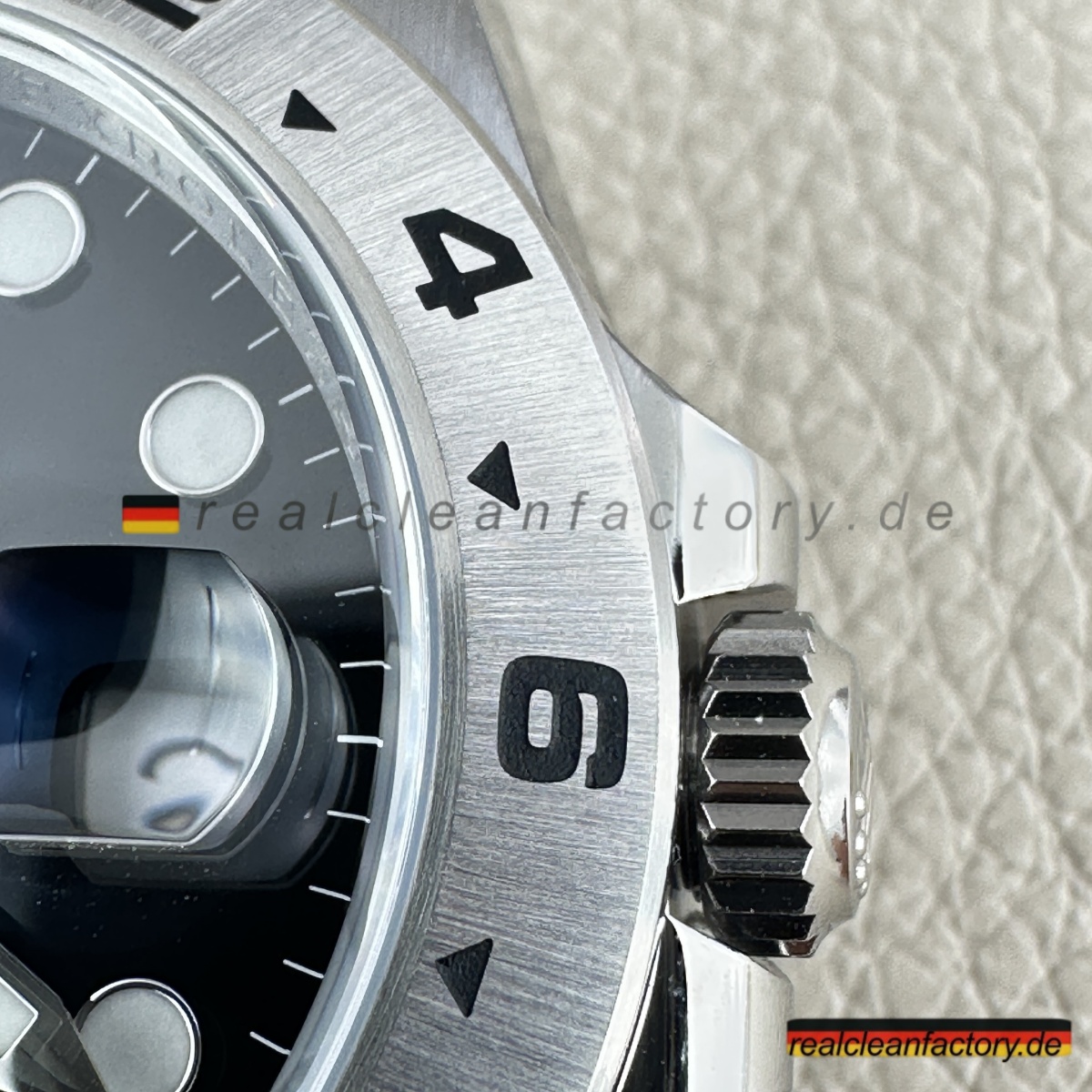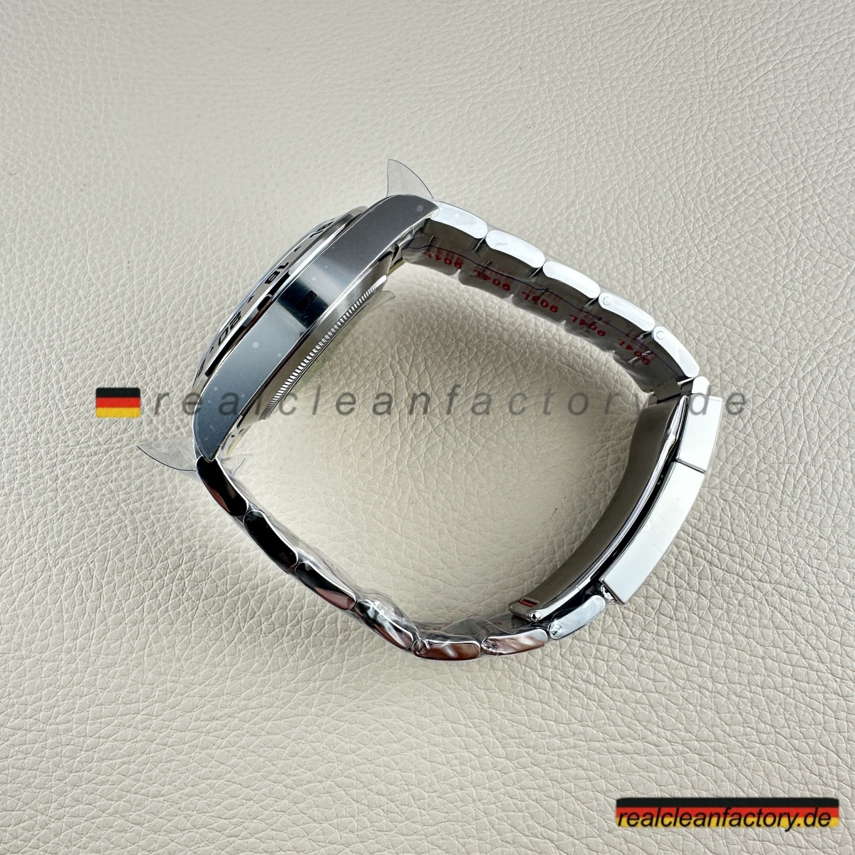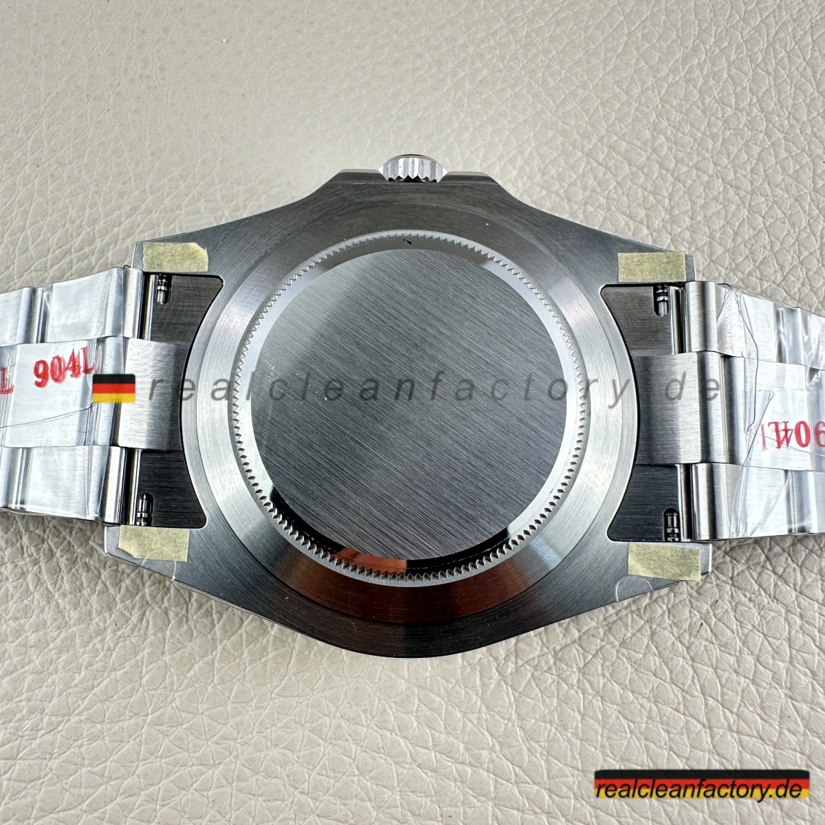 - Gehäuse aus 904L-Edelstahl mit korrekt direktionalem Satinfinish – keine hochglanzpolierten Flächen, die schon von weitem „Replik“ schreien. Feste Lünette aus Stahl mit klar gravierter 24-Stunden-Skala – funktional und präzise, genau wie sie sein soll.