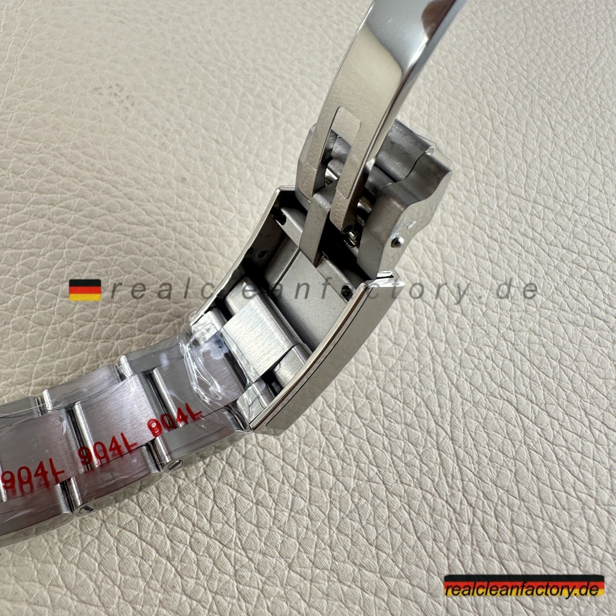 Das Oysterband ist top verarbeitet – die satinierten Mittelglieder passen exakt zur sportlichen Ausstrahlung. Kein Rasseln, keine scharfen Kanten – fühlt sich an wie echtes Rolex-Stahlband.