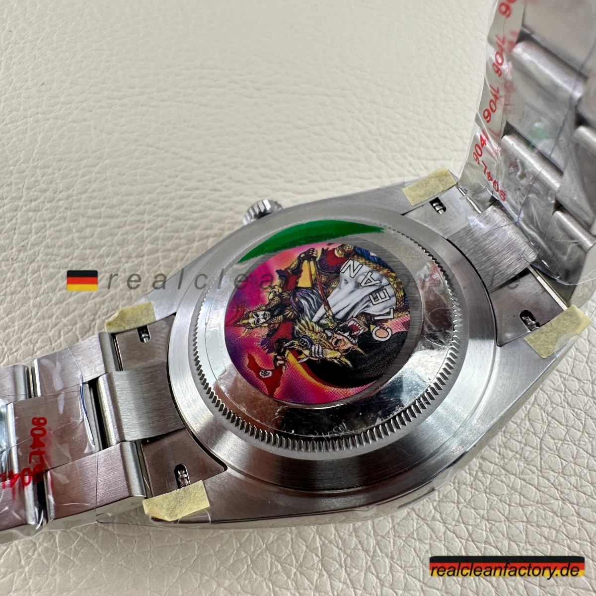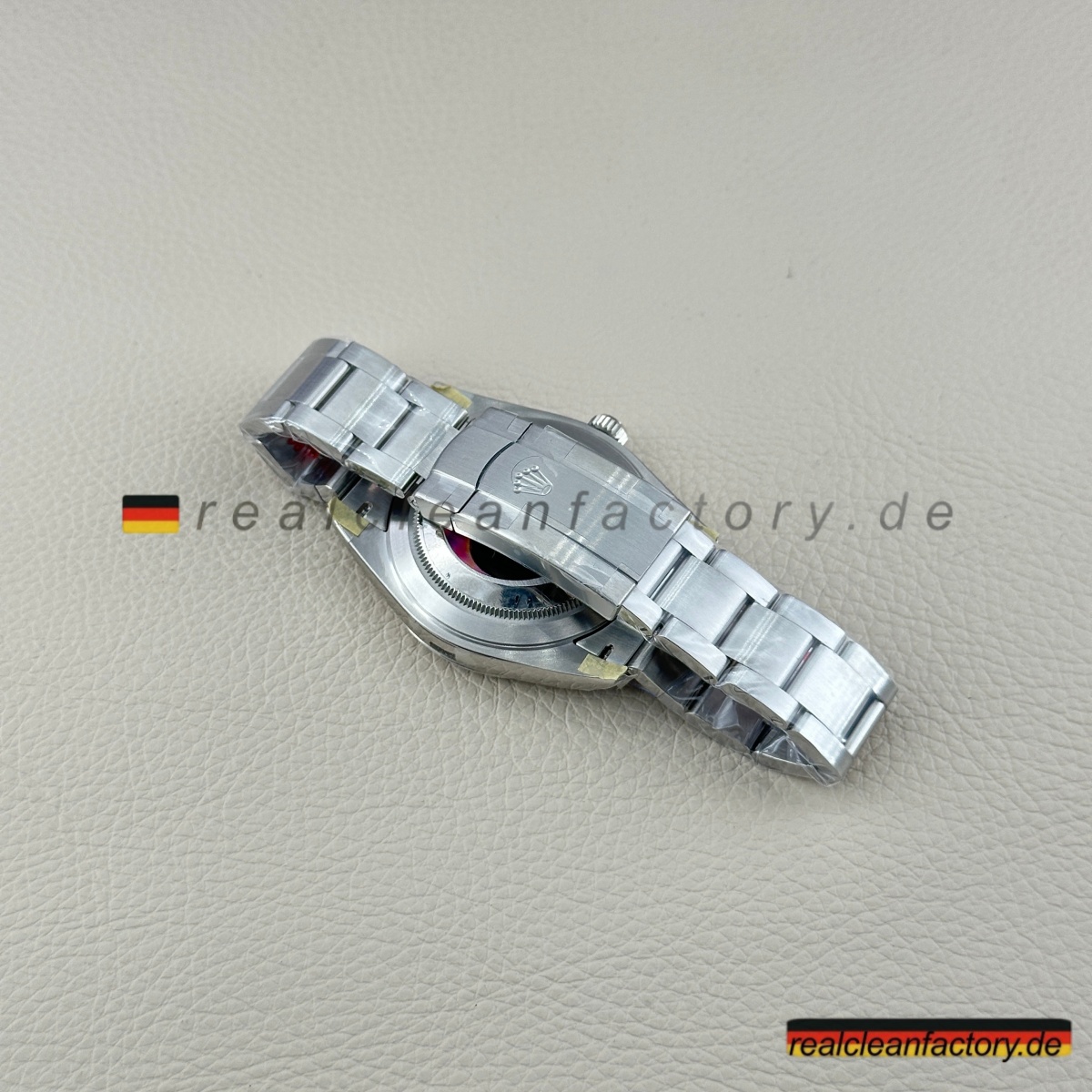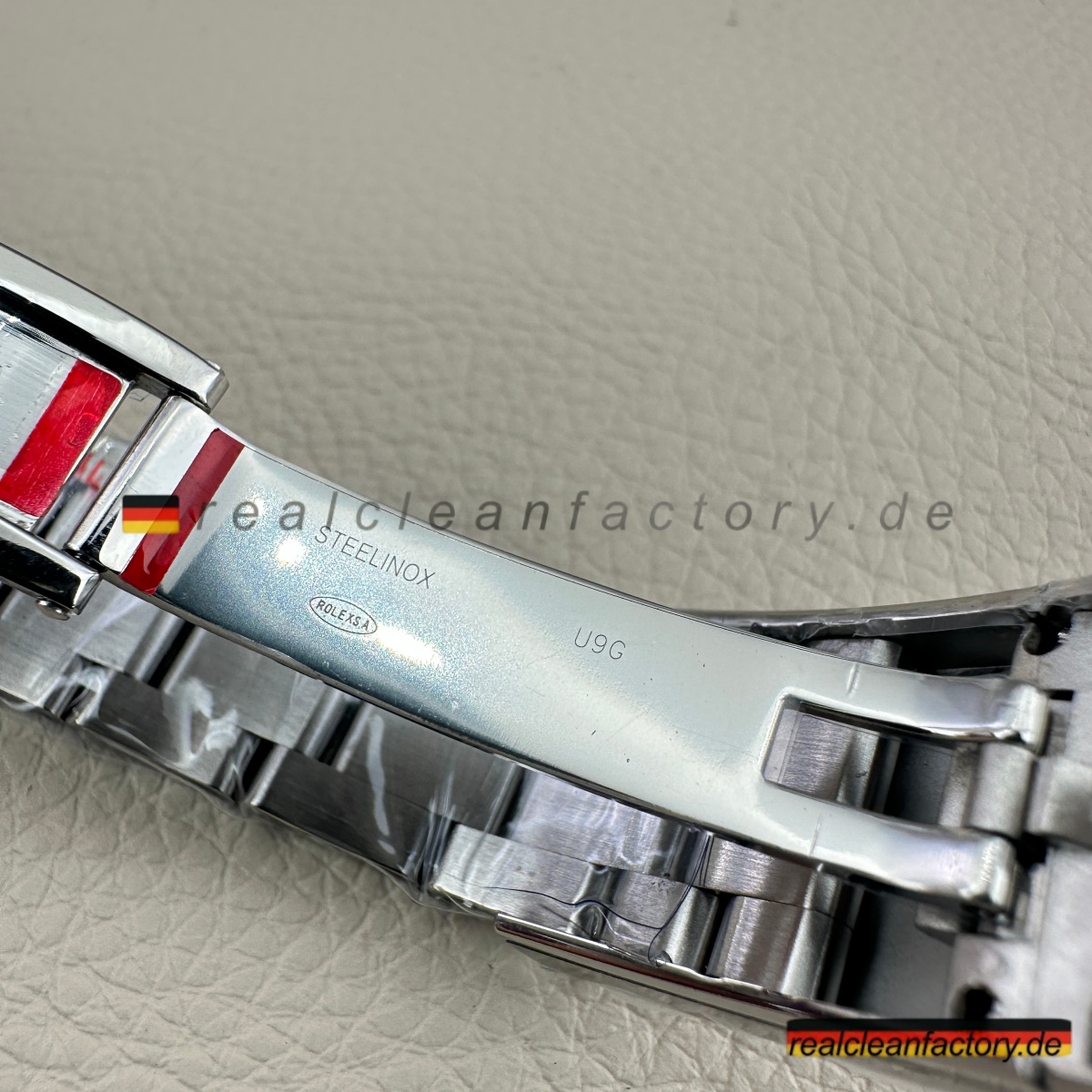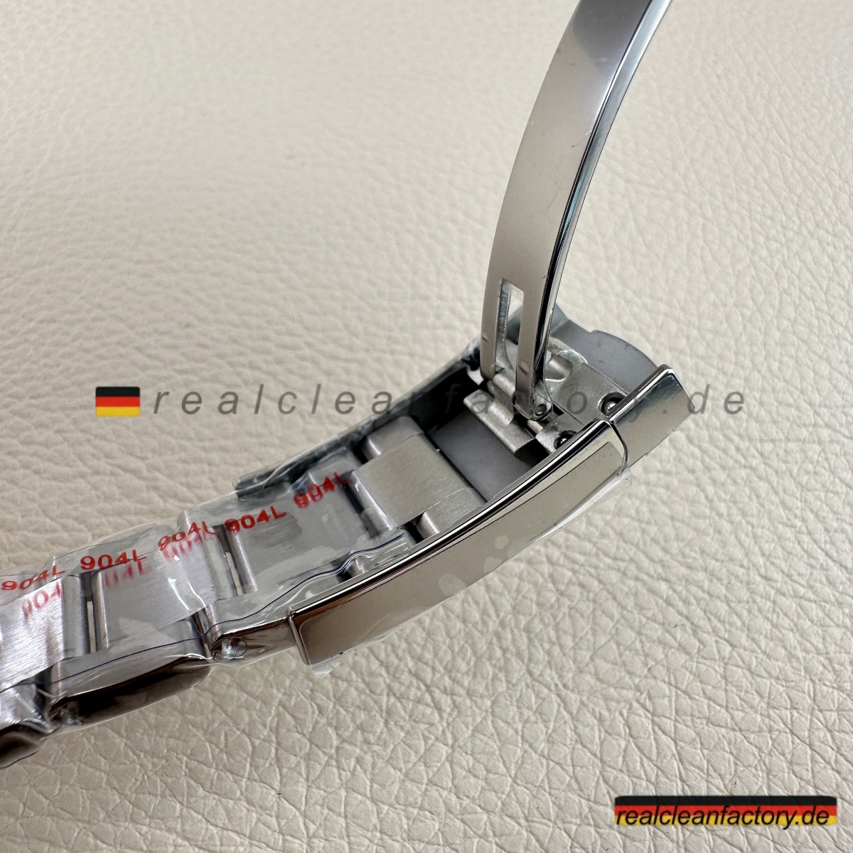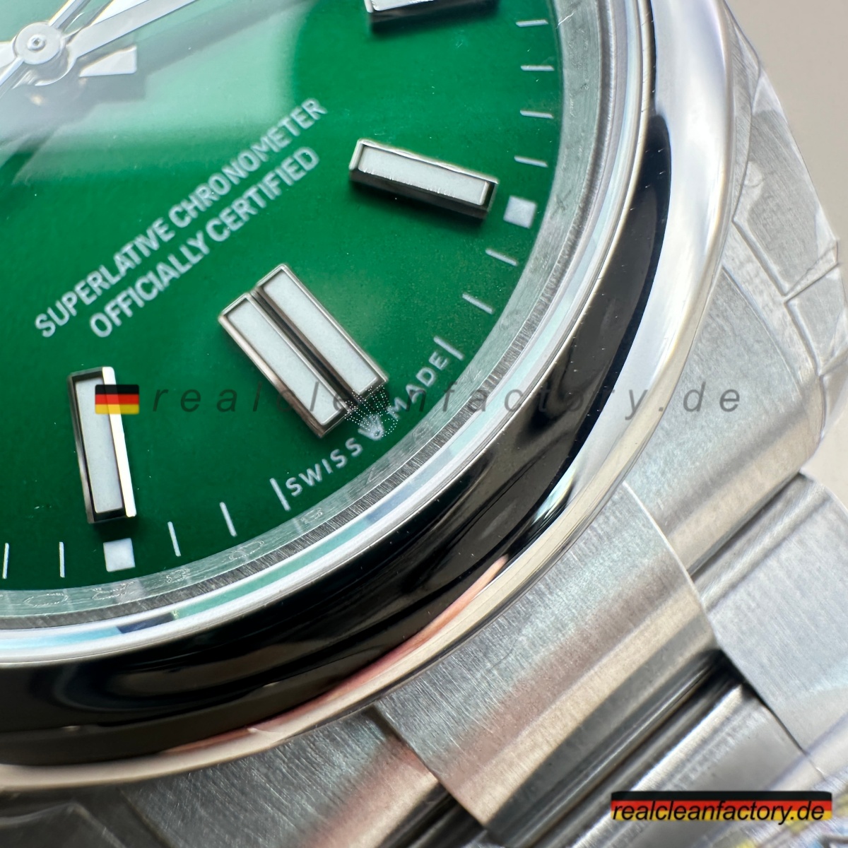 - Das grüne Sonnenschliff-Zifferblatt zeigt, wie weit Clean Factory der Konkurrenz voraus ist. Es ist kein Limetten- oder Olivgrün – sondern genau das satte, tiefe Waldgrün, das Rolex verwendet. Clean Factory hat lange an der perfekten Farbmischung gearbeitet. Das Ergebnis: Ein Zifferblatt, das im Kunstlicht elegant und dezent bleibt und im Tageslicht seine volle Tiefe entfaltet. Das ist der Farbton, bei dem andere Fabrikate sofort als Fälschung erkennbar sind.