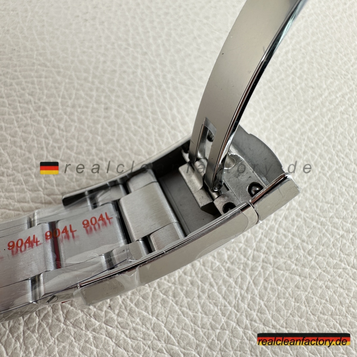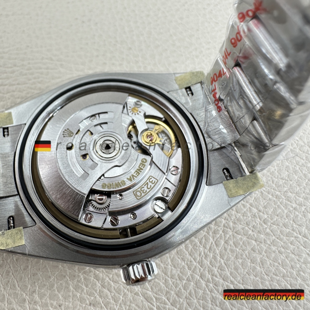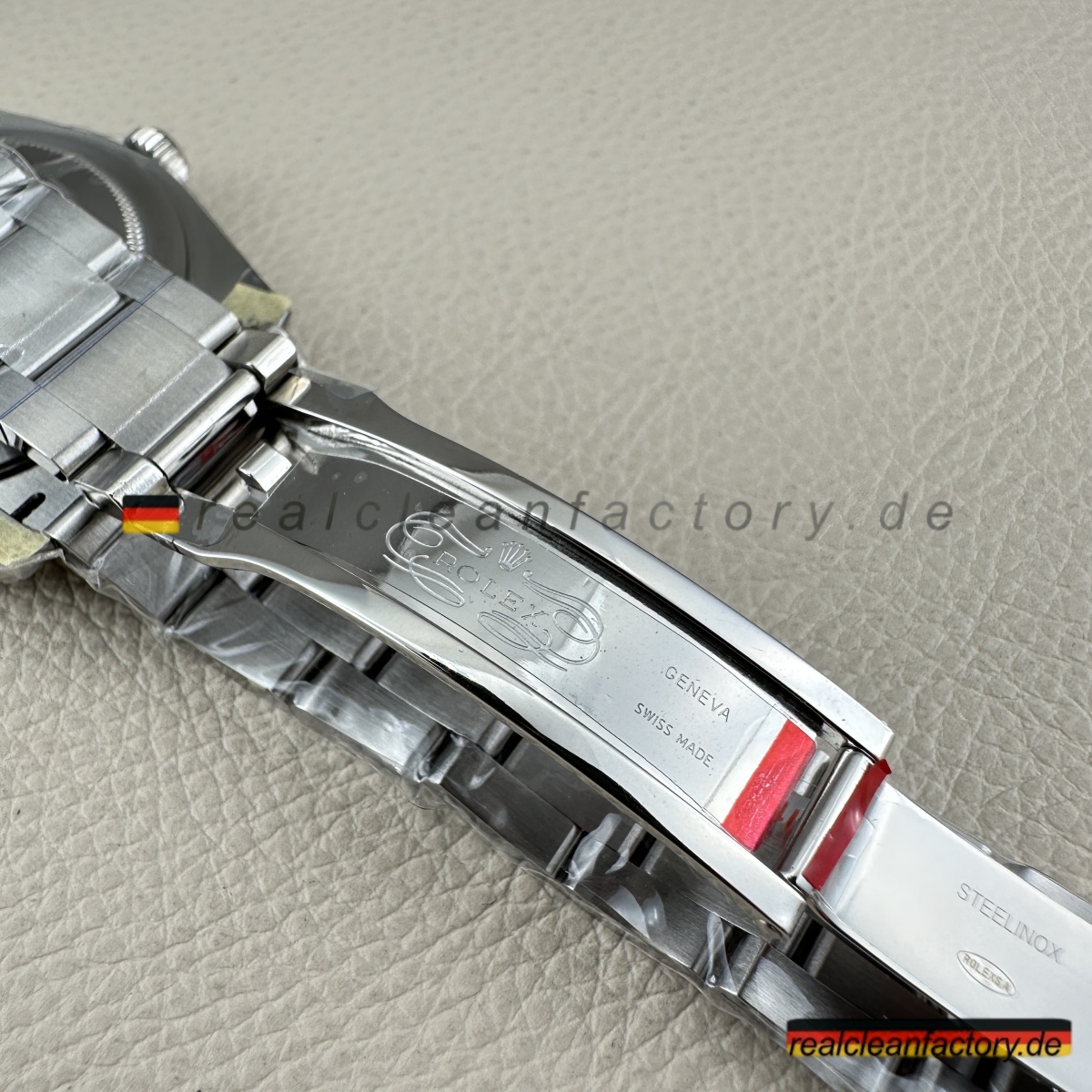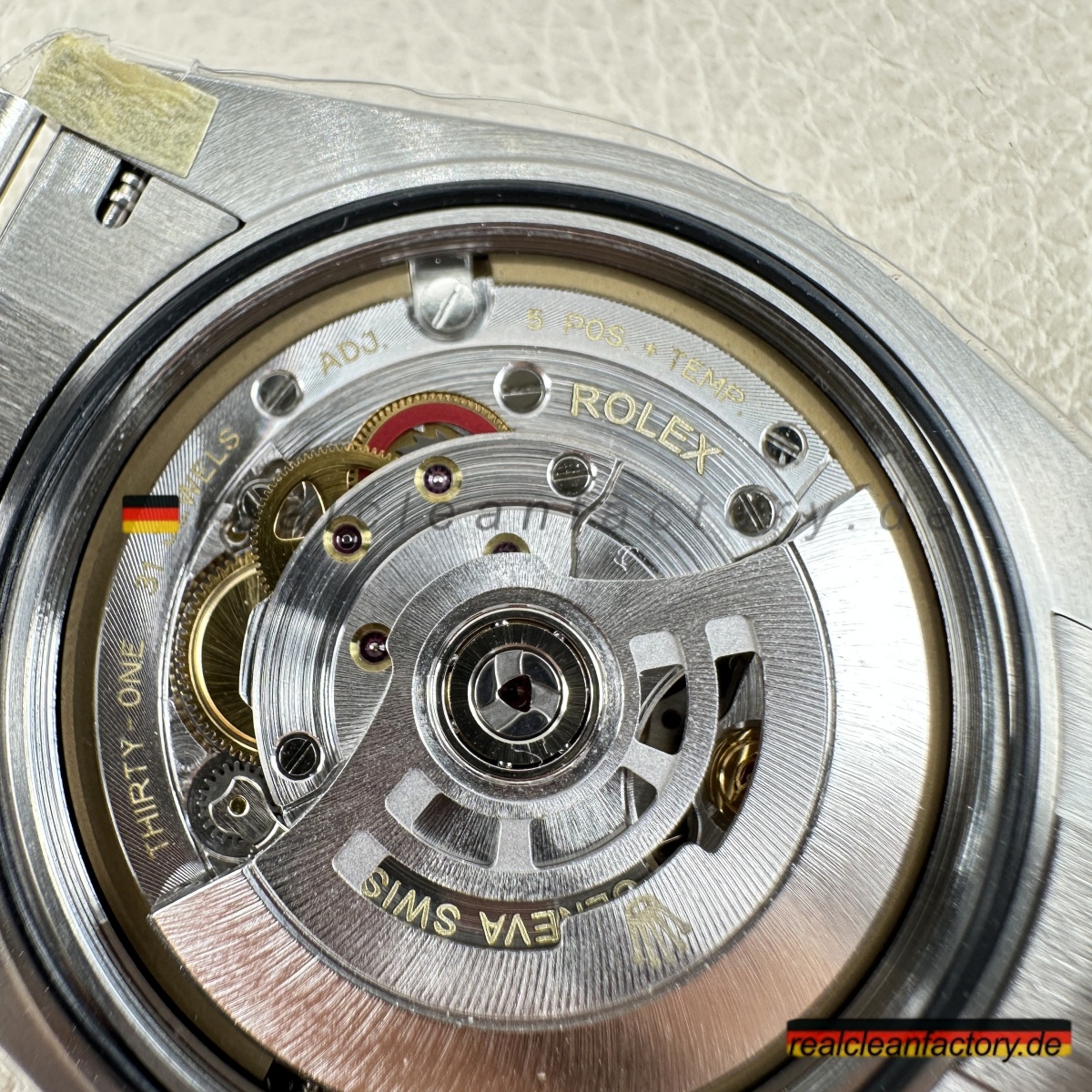 - Das Super Clone 3230 Werk zeigt Clean Factorys technisches Niveau. Neben der präzisen Zeitmessung sind alle Gravuren – Zahlen, Buchstaben, Rolex-Krone – identisch mit dem Original. Die Chronergy-Hemmung arbeitet zuverlässig, die 70-Stunden-Gangreserve erfüllt, was sie verspricht, und das Aufziehen fühlt sich echt schweizerisch an. Jede Kronenposition rastet mit dem typischen Widerstand ein, den Kenner sofort erkennen.