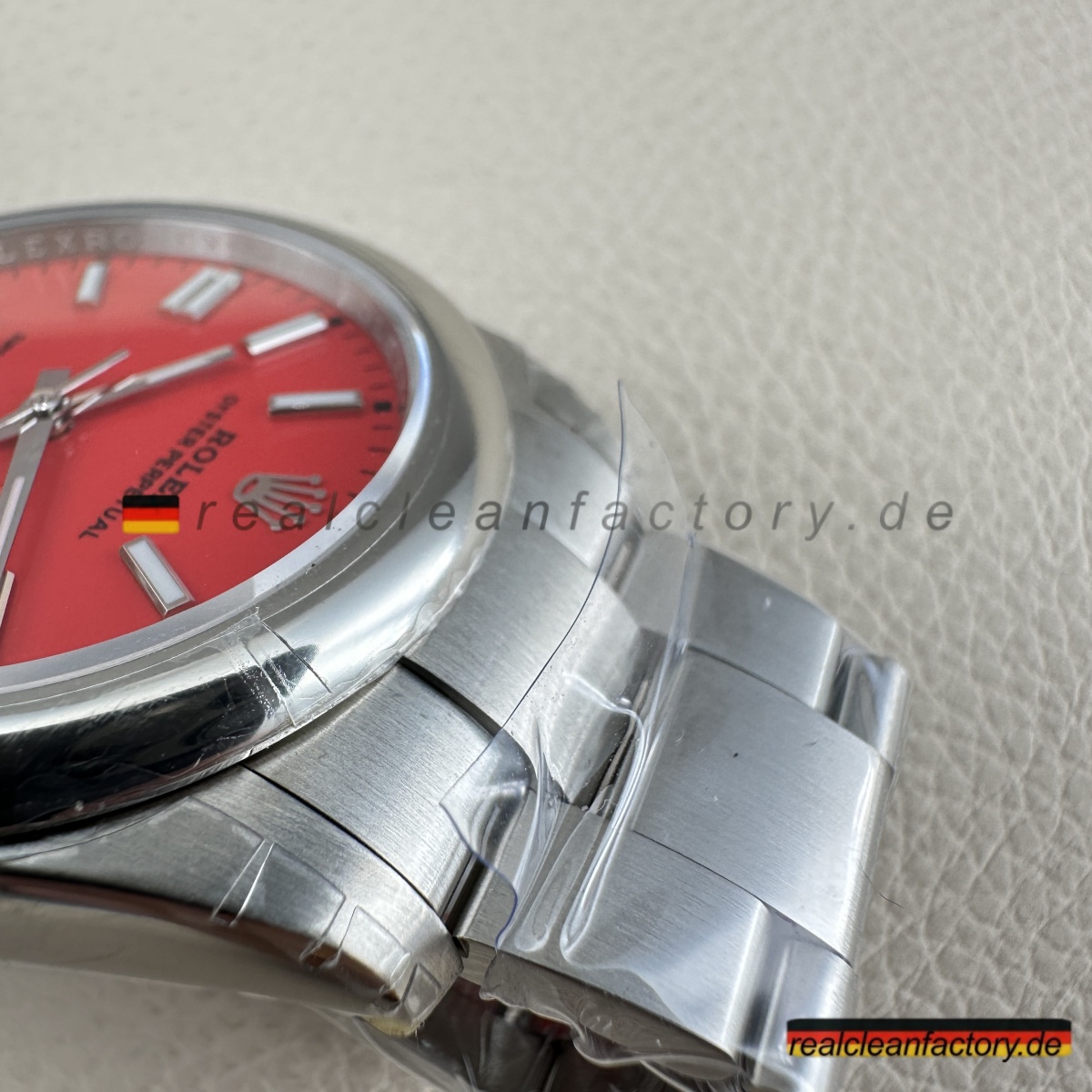 - Die Rolex Oyster Perpetual 124300-0007 Super Clone von Clean Factory bringt selbstbewusste Farbe in die Kollektion. Das ist kein knalliges Feuerwehrrot oder leuchtendes Kirschrot – es ist ein tiefes, sattes Rot, das auffällt, ohne laut zu wirken. Rolex hat diesen Farbton gewählt, weil er Menschen anspricht, die etwas Besonderes wollen, dabei aber Stil bewahren. Keine Datumsanzeige, keine überflüssigen Features – nur präzise Zeitmessung in einer Farbe, die zeigt, dass Sie sich gerne abheben. Das 41mm-Gehäuse bleibt dabei angenehm tragbar, und Clean Factory liefert mit dem Super Clone 3230 Uhrwerk ein Ergebnis, bei dem jede Gravur, Zahl und jedes Detail exakt dem Original entspricht.