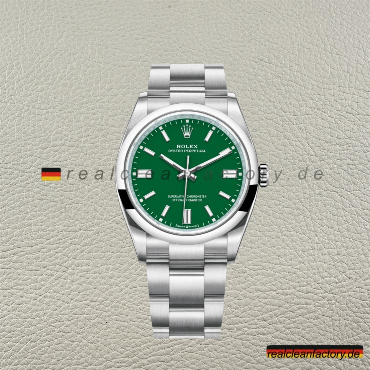 • Die Rolex Oyster Perpetual 126000-0005 von Clean Factory mit grünem Zifferblatt löst eines der größten Probleme in der Replika-Herstellung. Grün ist seit jeher eine Herausforderung – oft entstehen zu grelle oder zu olivfarbene Töne, die das Original nie erreichen. Das Geheimnis liegt nicht nur im Farbton selbst, sondern auch darin, wie das spezielle Waldgrün von Rolex unter verschiedenen Lichtbedingungen wirkt. Clean Factory hat unzählige Originale analysiert, um eine Pigmentmischung zu entwickeln, die dieses satte, tiefgrüne Zifferblatt authentisch wiedergibt – ein Farbton, der je nach Licht zwischen warmen und kühleren Nuancen changiert.