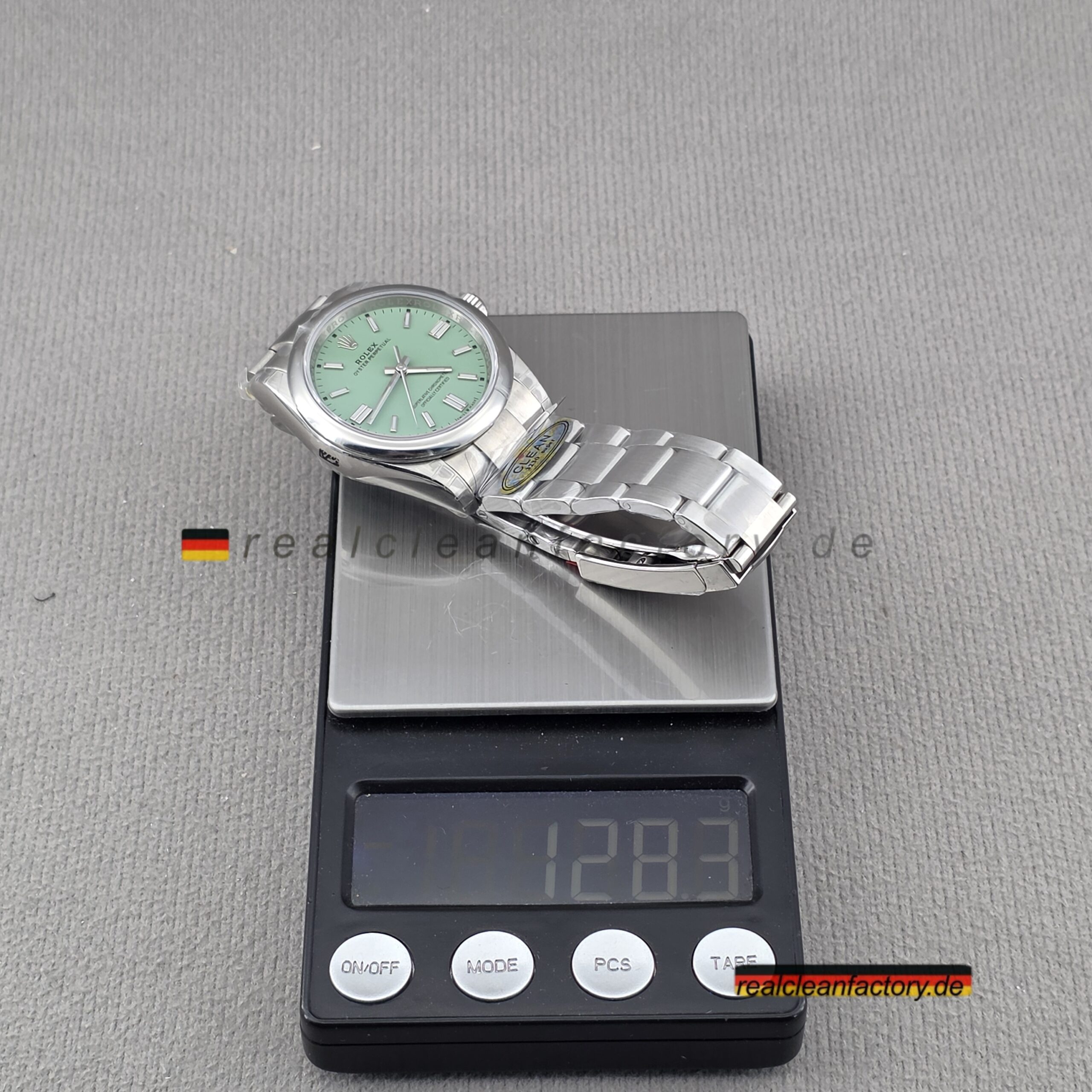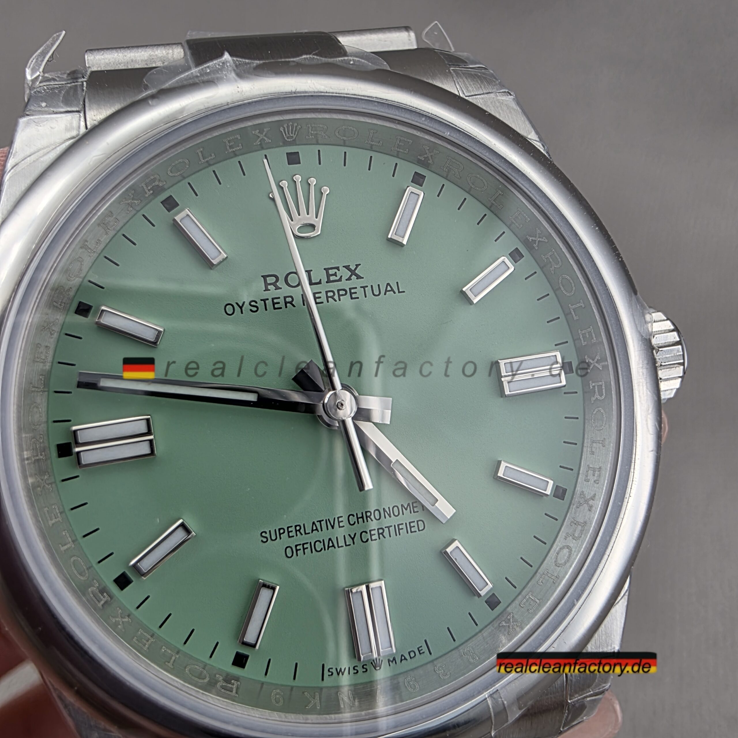 • Der Druck auf dem Zifferblatt zeigt Clean Factorys technisches Know-how bei hellen Farben. Schweizer Ölfarben sorgen dafür, dass die „OYSTER PERPETUAL“-Beschriftung und der Zertifizierungstext jederzeit gut lesbar bleiben. Helle grüne Hintergründe können die Sichtbarkeit erschweren, doch Clean Factorys Ausstattung meistert das mühelos.