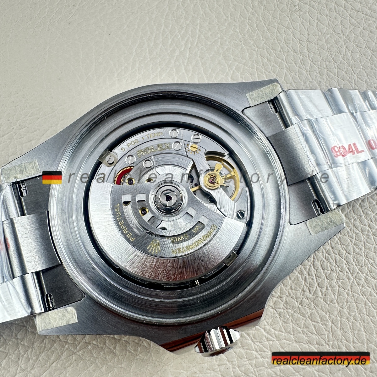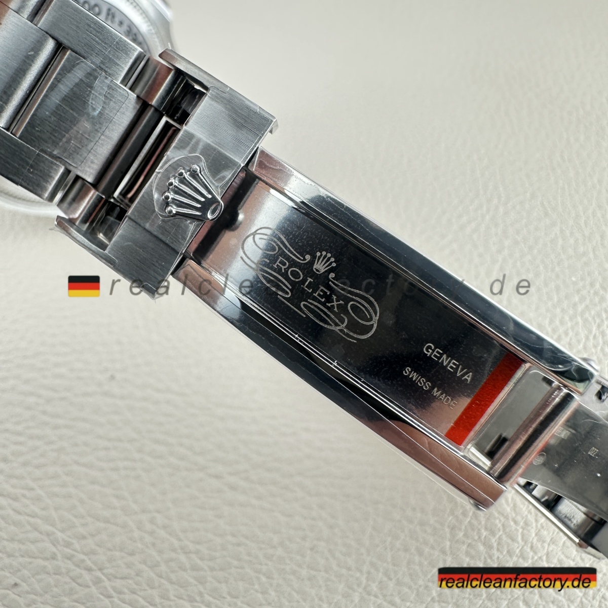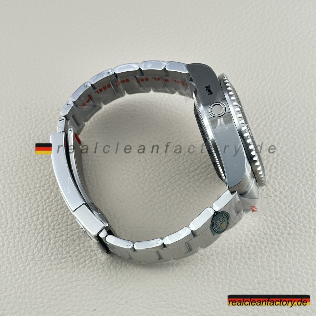 • Besonders bemerkenswert ist die verfeinerte Gehäuseverarbeitung. Rolex hat 2024 die Schliffmuster auf den Hörnern und den Glanzgrad der polierten Flanken angepasst. Man erkennt diese Details nur, wenn man sie sucht – Clean Factory hat sie alle erkannt. Die Gehäuseoberfläche entspricht exakt dem Original: die Übergänge zwischen gebürsteten und polierten Bereichen, die Richtung der Bürstung, sogar die spezifische Polierqualität.