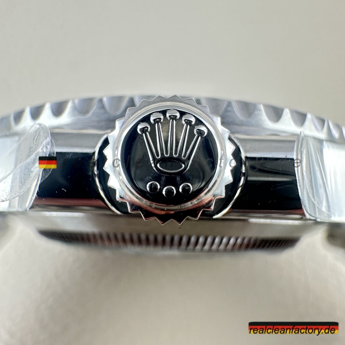 - Drehen Sie die Lünette – Sie merken den Unterschied sofort: 120 präzise Klicks mit perfektem Widerstand und absolut null Spiel. Das ist nicht nur optisch identisch, sondern genau das haptische Erlebnis, das man vom Original erwartet. Das schwarze Zifferblatt sorgt für perfekten Kontrast, mit gestochen scharfer weißer Beschriftung und makellos ausgearbeiteten Indizes. Die Zeiger im Weißgold-Stil ziehen ruhig ihre Bahn mit genau den richtigen Reflexionseigenschaften – nicht zu auffällig, nicht zu matt, sondern exakt so, wie sie sein müssen. Selbst bei direktem, starkem Licht wirkt das Zifferblatt stets ruhig und hochwertig, ohne Druckfehler oder Ausrichtungsprobleme.
