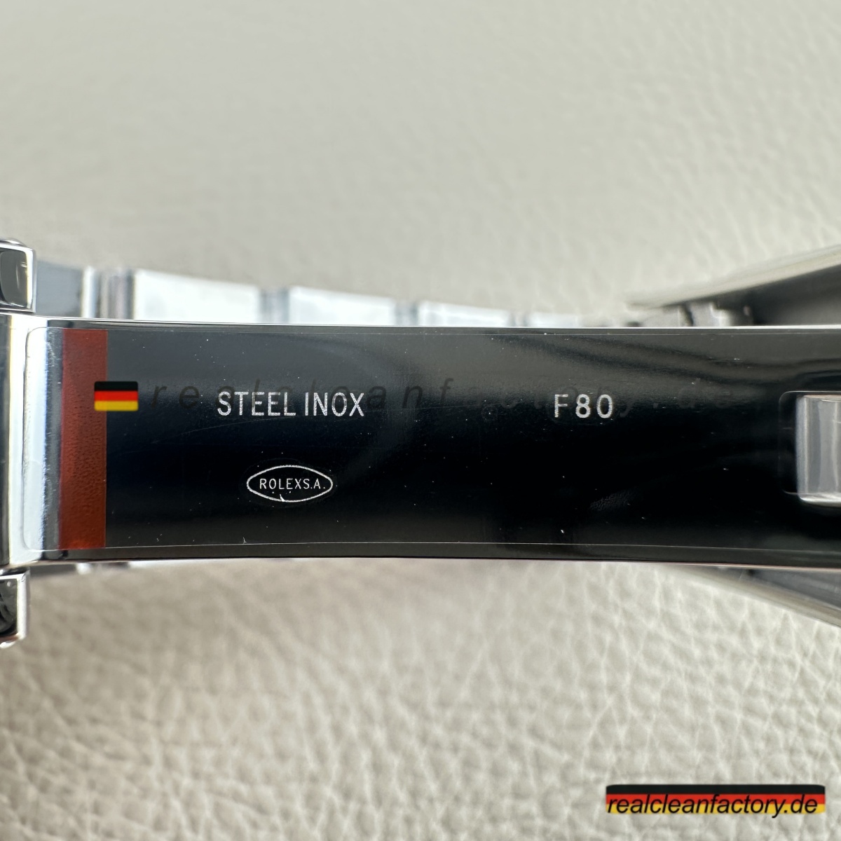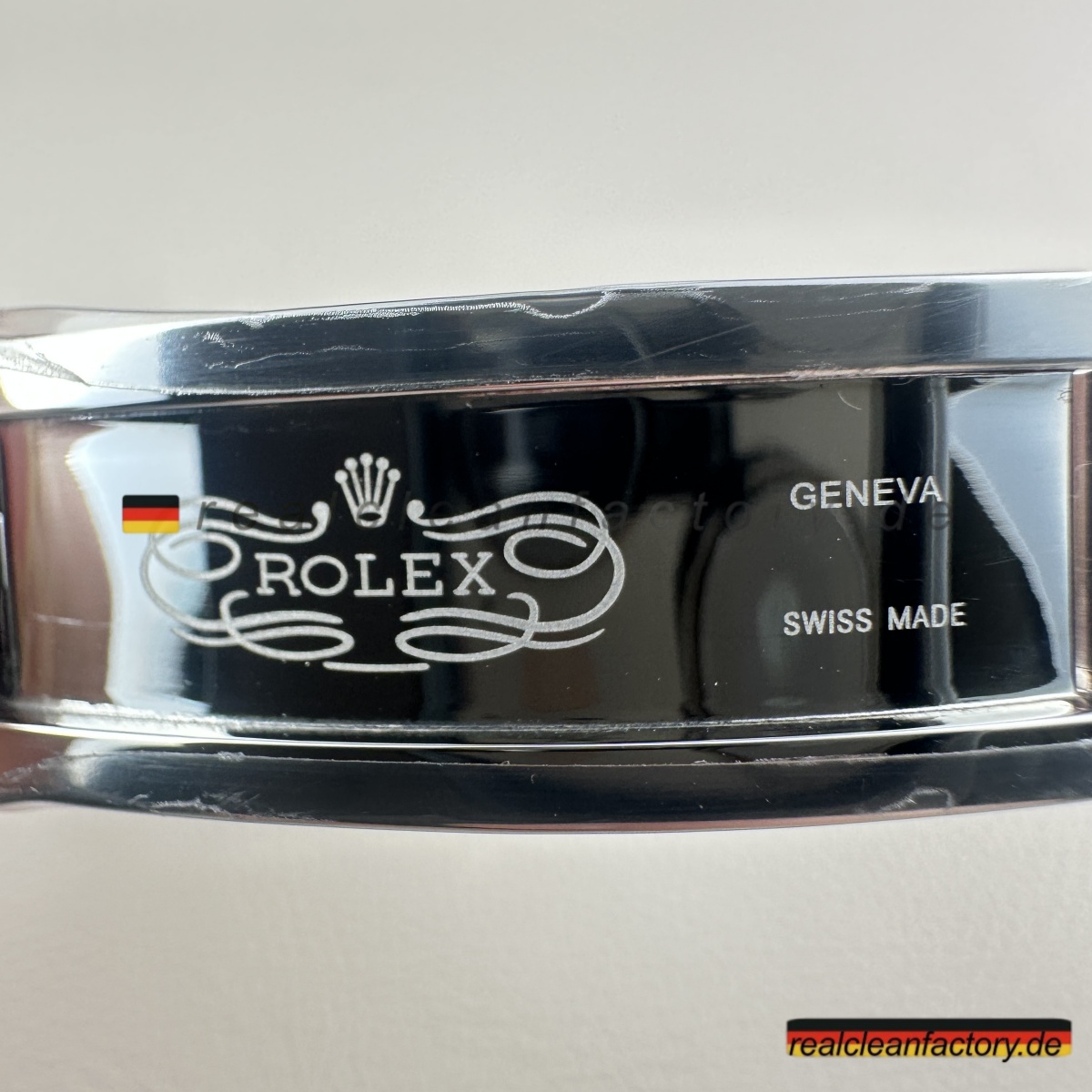 Die Gravur in der Rehaut ist eine der besten, die ich bisher bei einem Super-Clone gesehen habe. Die ‚ROLEX ROLEX‘-Schrift ist gestochen scharf, gleichmäßig positioniert, und die Seriennummer bei 6 Uhr sitzt absolut mittig zwischen den Indexen.