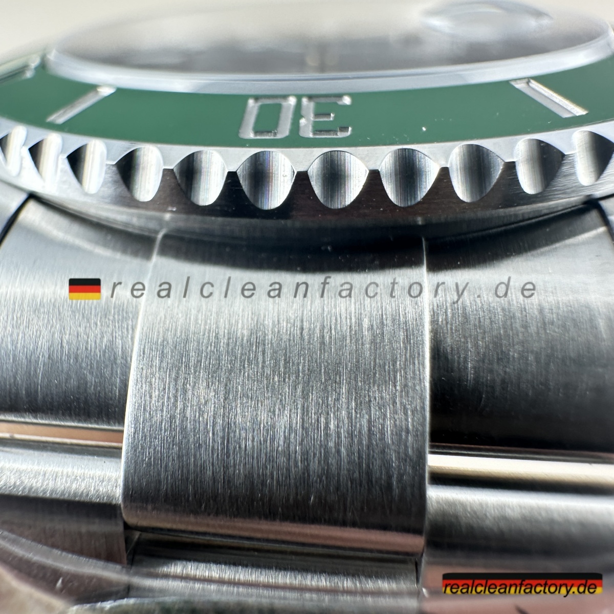 Die Keramiklünette hat denselben Glanzgrad wie bei meinem echten 116610LN. Es ist nicht dieses billige spiegelnde Finish, das man bei Low-End-Repliken sieht, sondern ein seidenmatter Schimmer, der dem Original sehr nahe kommt.